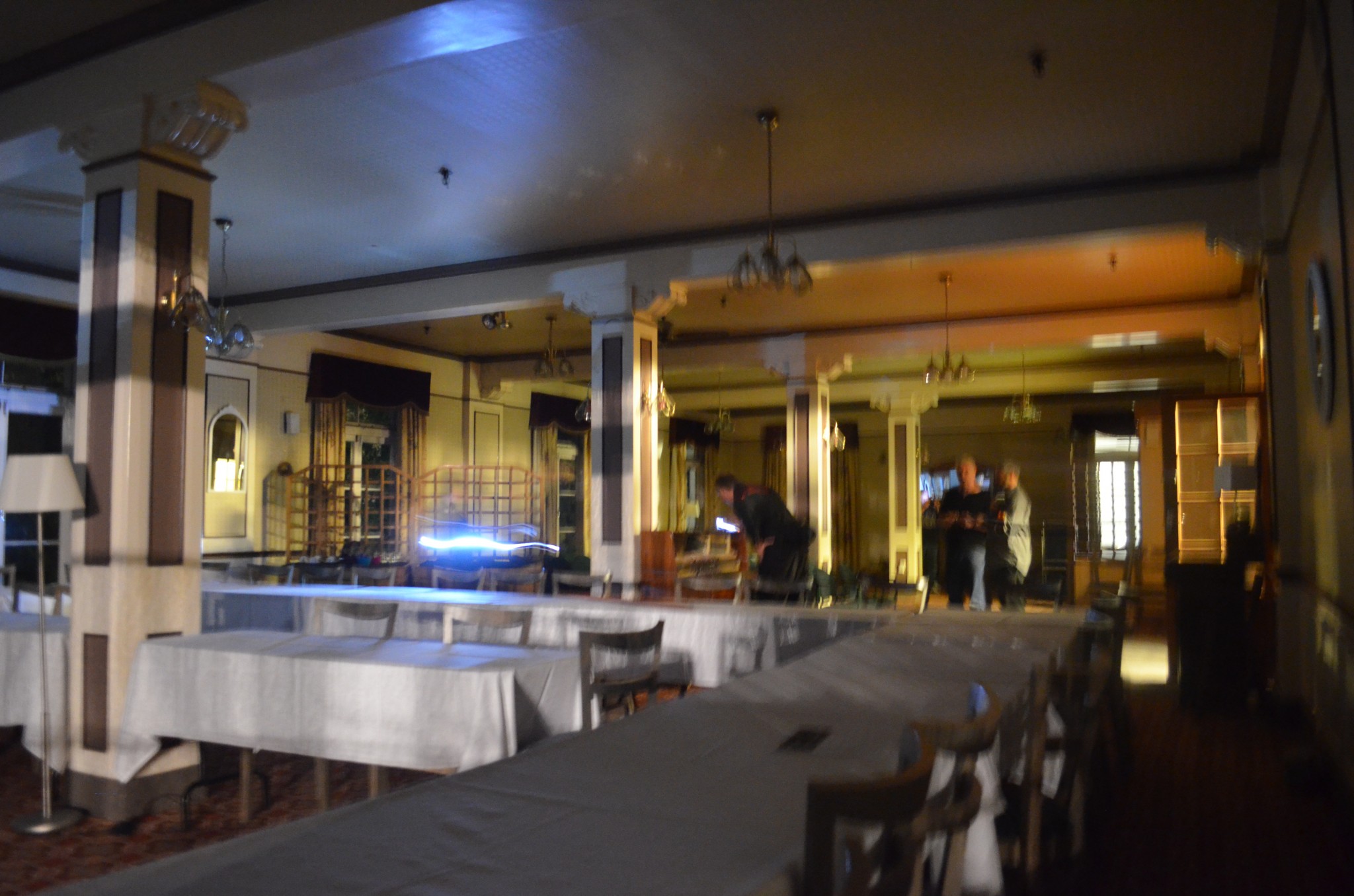 Patrick had earlier reported seeing a dark streak move left to right across the landing by the first set of doors (top of stairs that lead down to Frederick Mace Restaurant): “This time, each time I looked toward this area, I thought I could see some kind of movement, either near or behind the table lamp, or in the shadow area in the middle of the corridor. I was alternating my view, looking down the corridor to the left (back toward the main landing above the entrance foyer, Room 12a) and down the corridor to the right (there’s about a 45 degree angle between these two corridors, Rm 18 is at the angle). Each time I looked to the right, I thought I saw movement. I took a number of photos. I saw no movement in the other direction, even though the architecture and lighting conditions were very similar (glass doors at the end, table lamps down the hallway).”