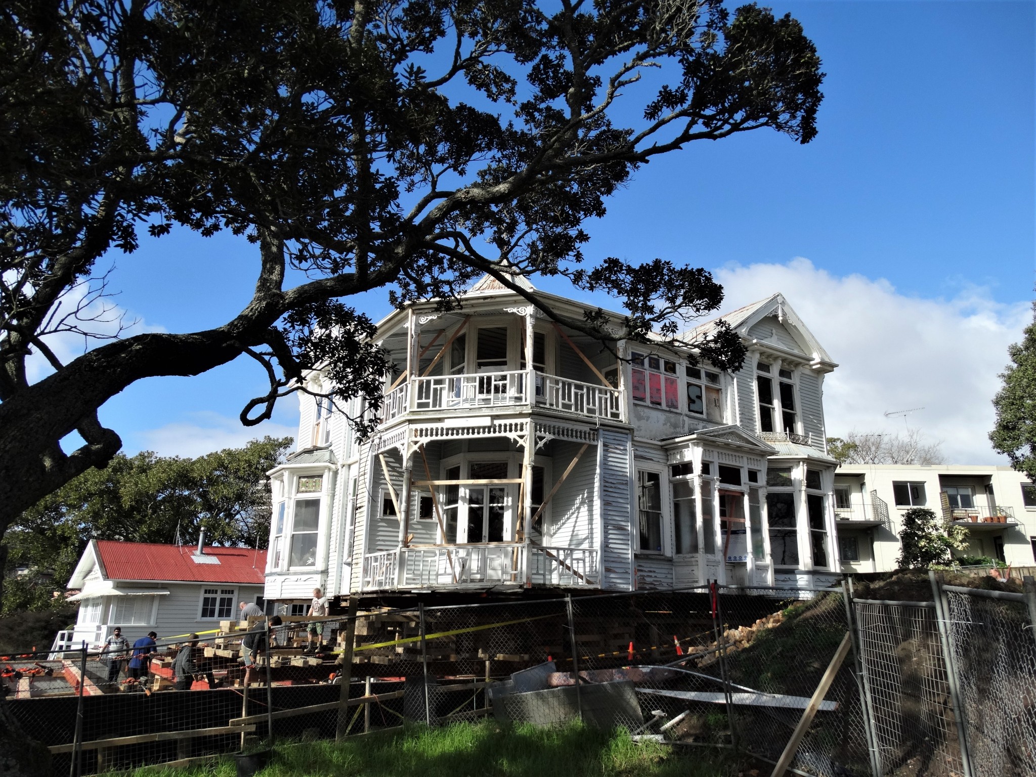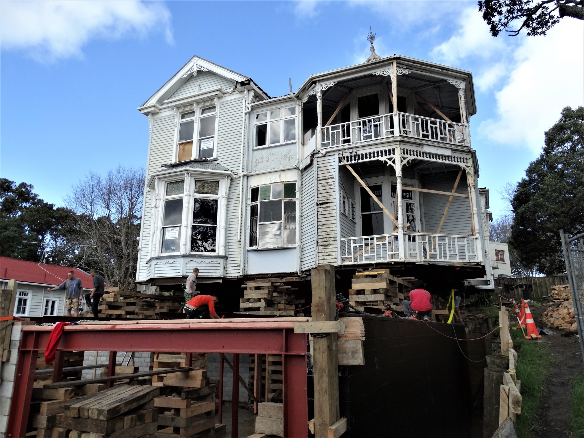 I spoke to the owner, who tells me they purchased the house three years ago but have been unable to touch it due to all the ongoing council red tape and a seemingly endless stream of fees and paperwork. Work is now underway to slowly and delicately roll the house forward onto its new foundations a few meters from is original position.