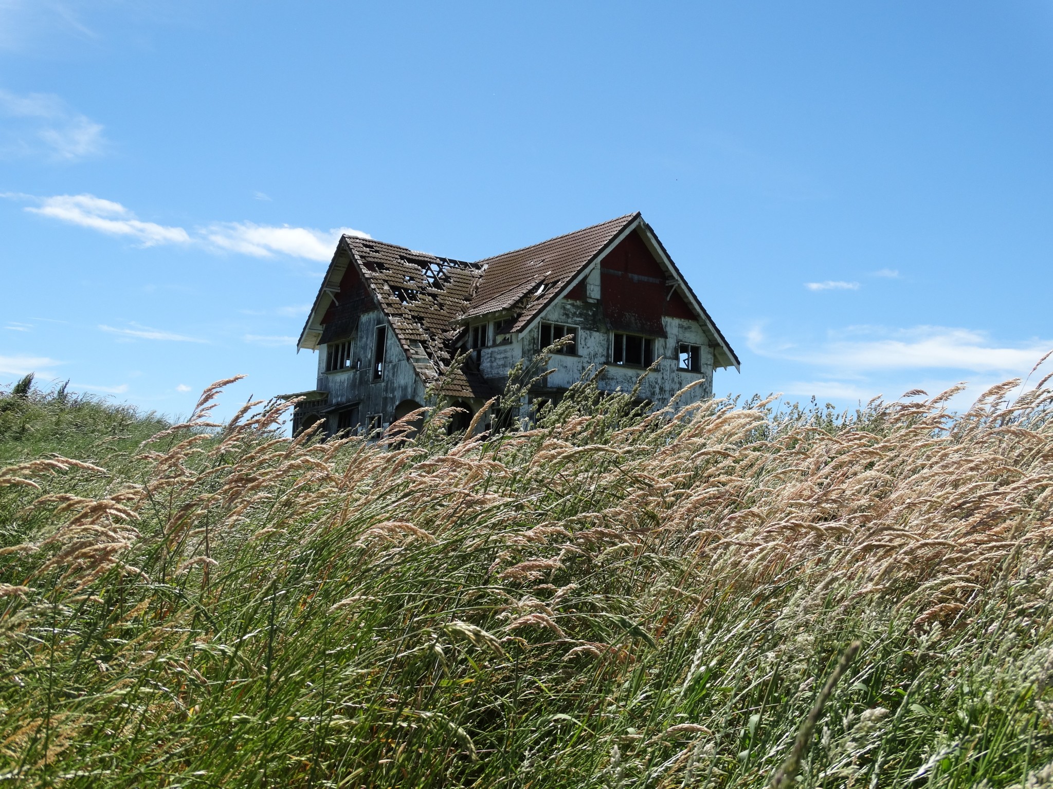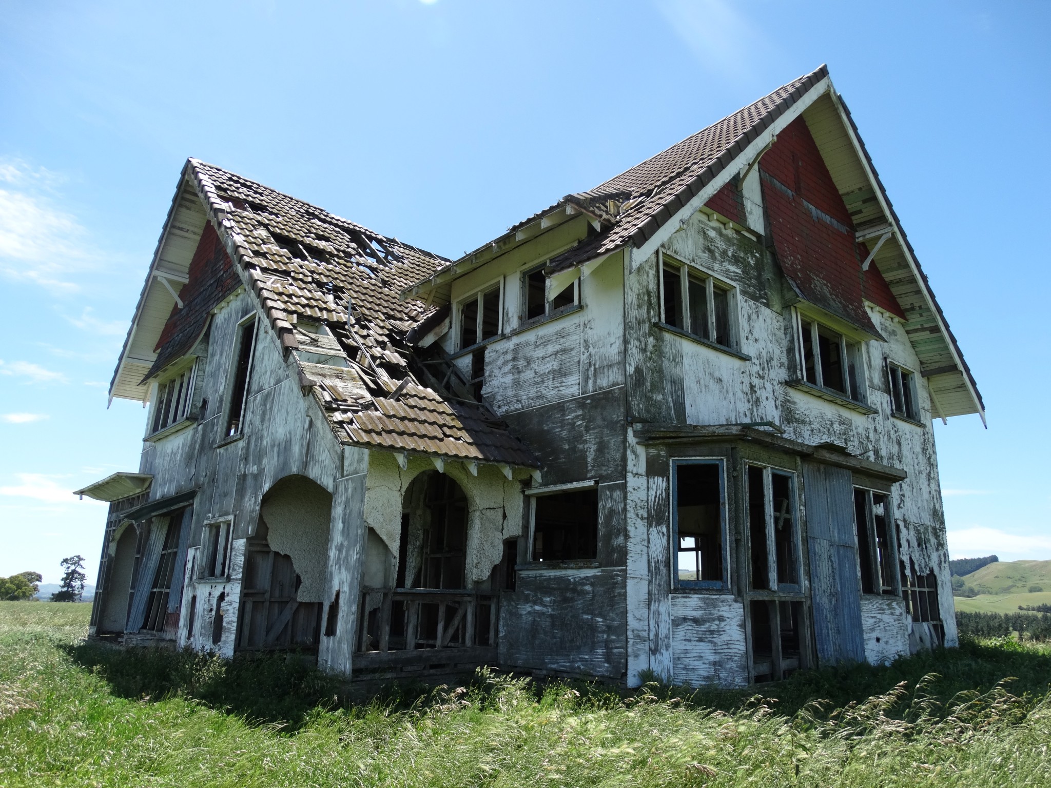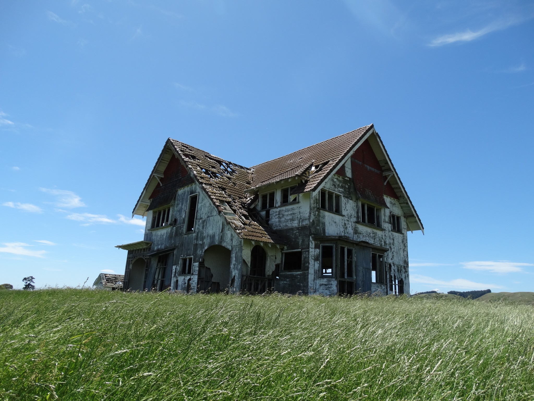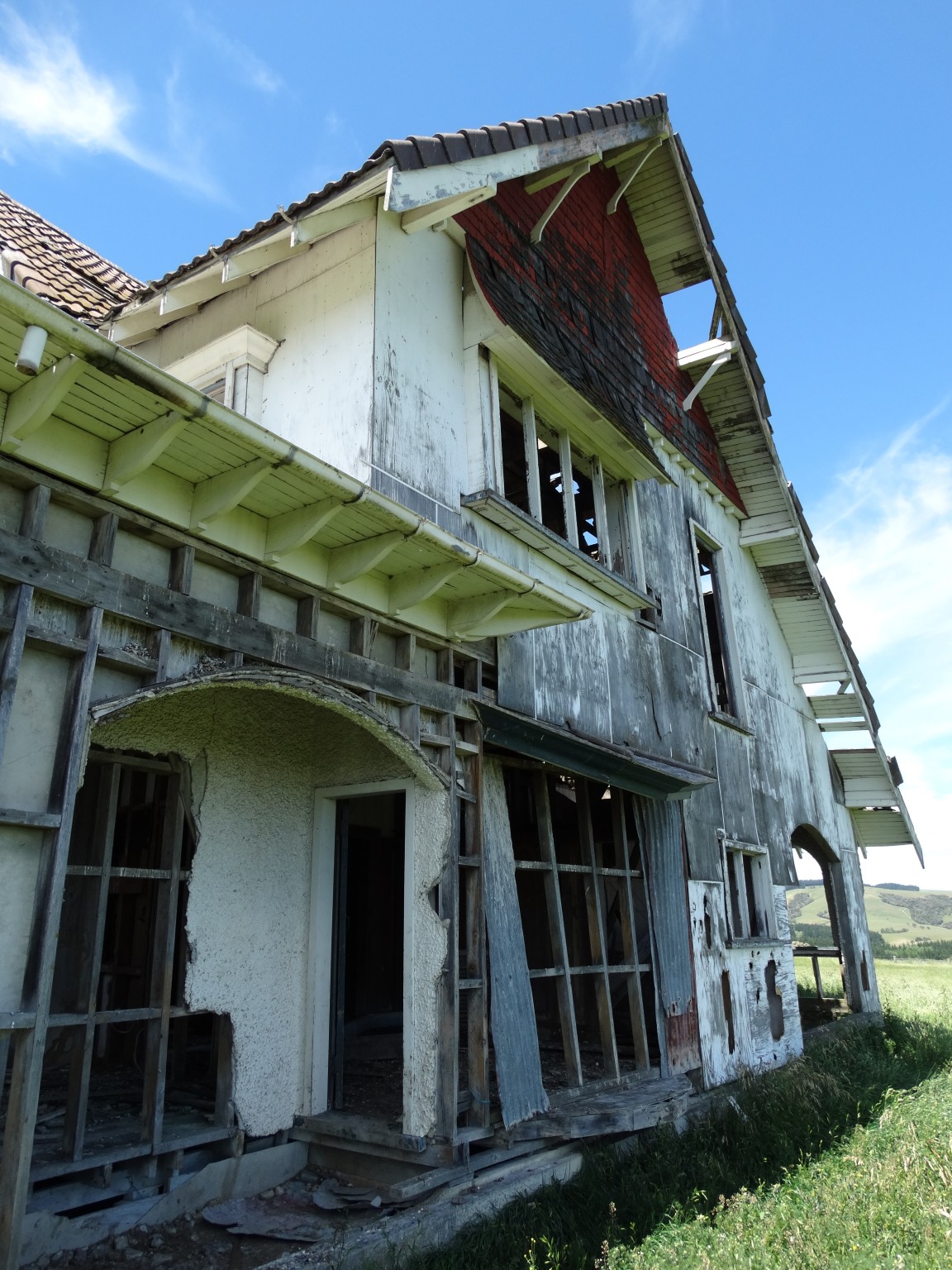 Perhaps the most frequently enquired after house in Wairarapa is a derelict mansion that sits atop a ridge in the Ahiaruhe district, across the road from Stonehenge Aotearoa. It must surely be the most photographed building in Wairarapa.