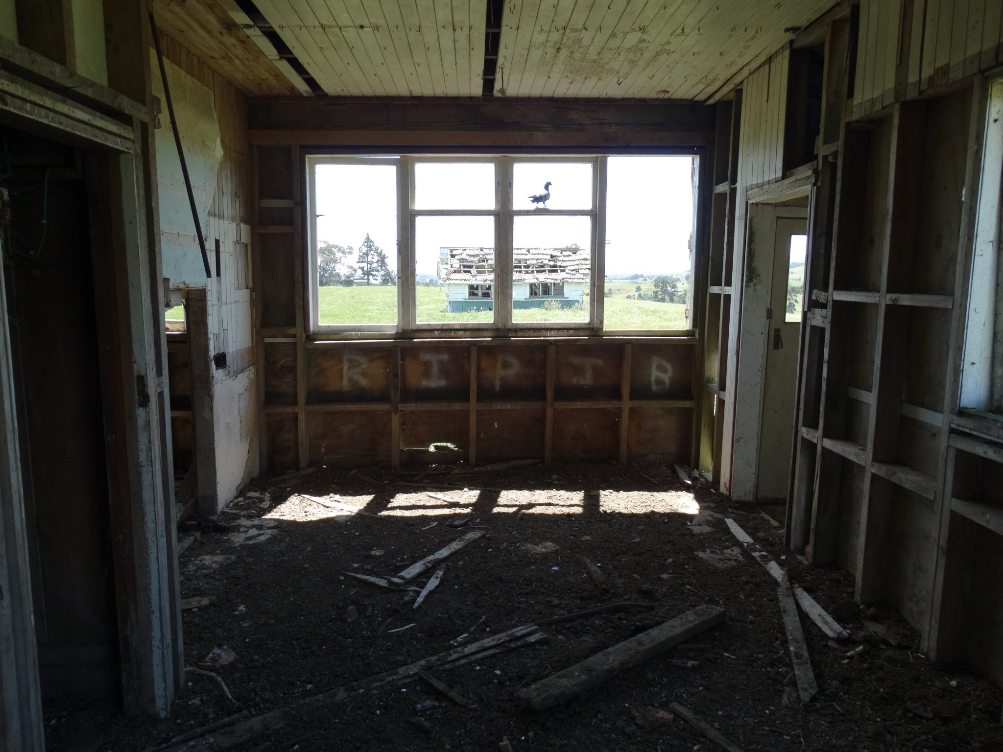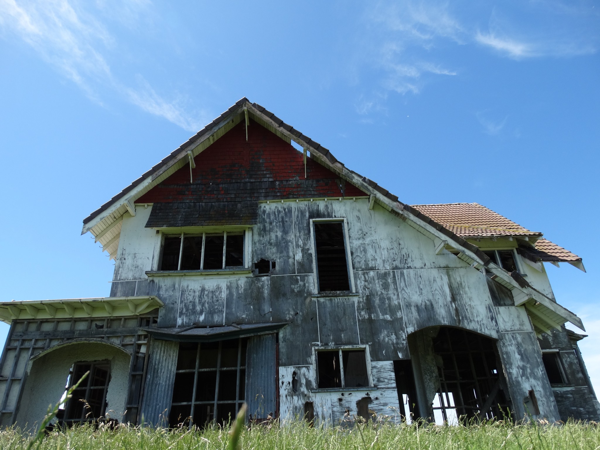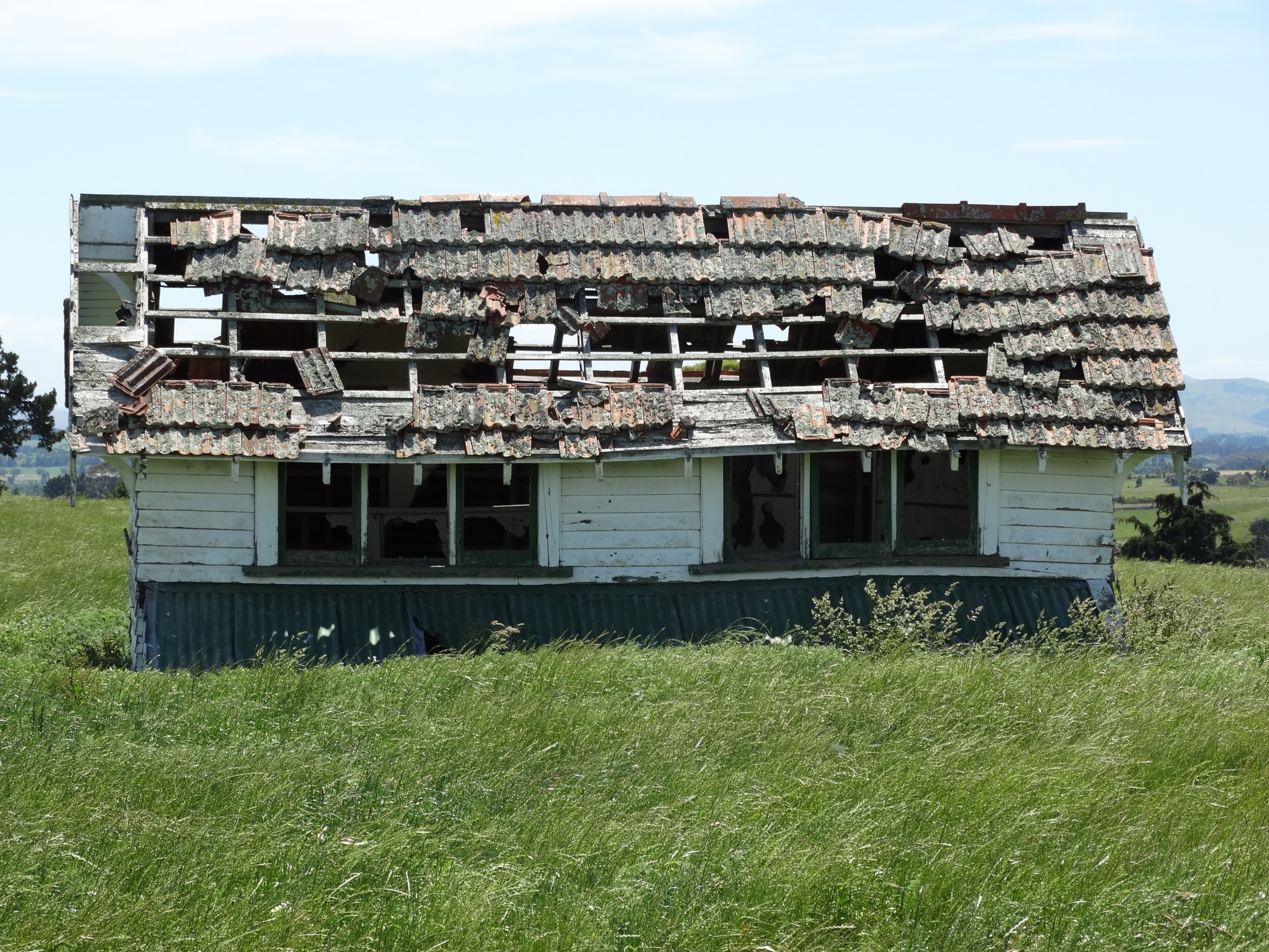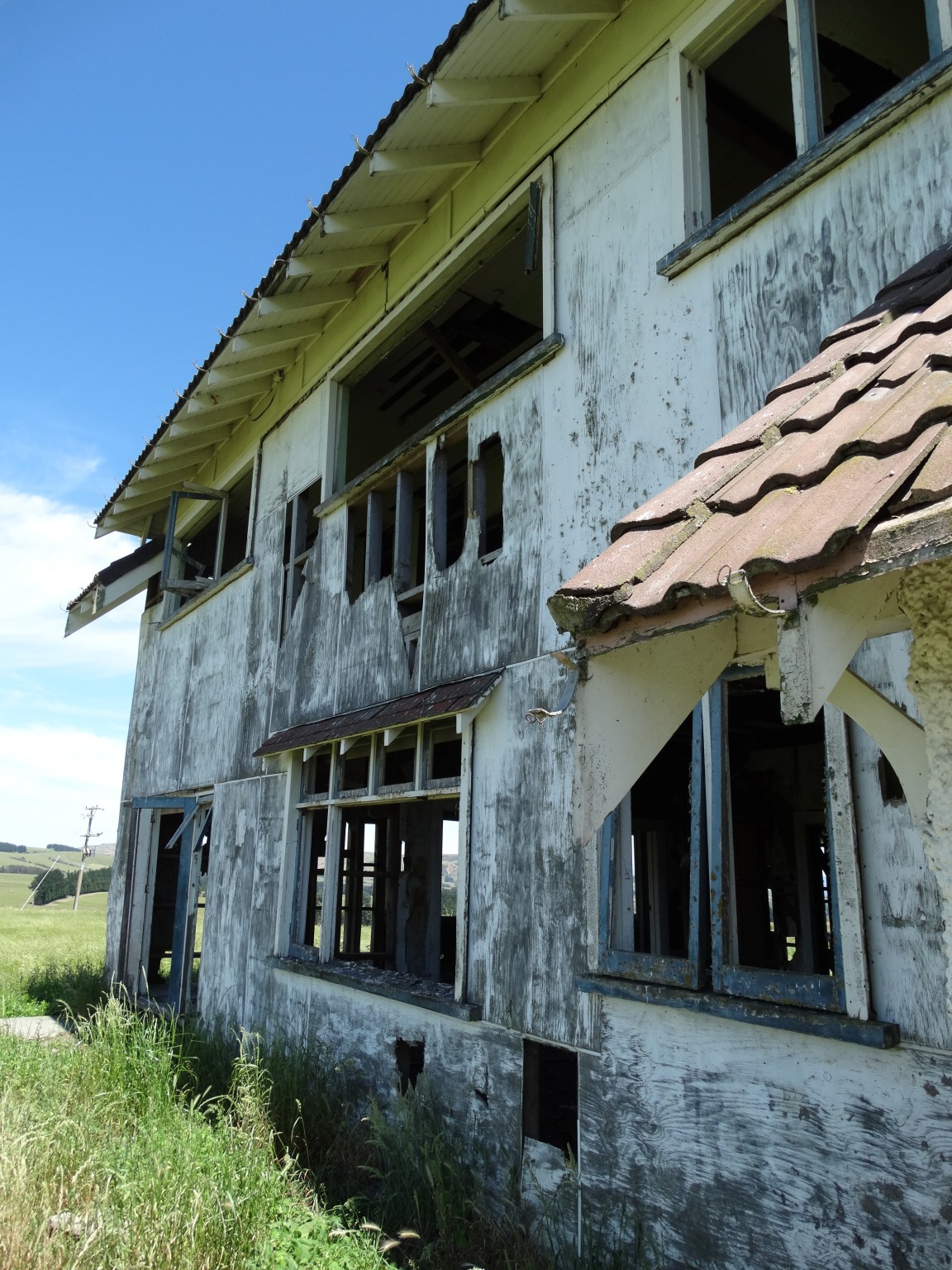 The building was shifted in two pieces, and it took some time before the second storey was added to the ground floor. Before it could be completed, family difficulties led to the project being abandoned, and the house now sits along and forlorn on the top of a ridge, overlooking the Wairarapa plain and the Tararua Range, and open to the weather from all directions.