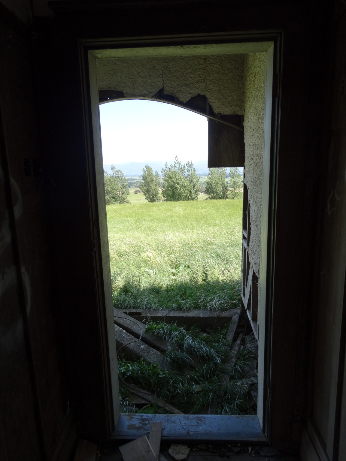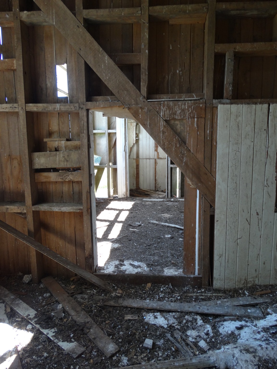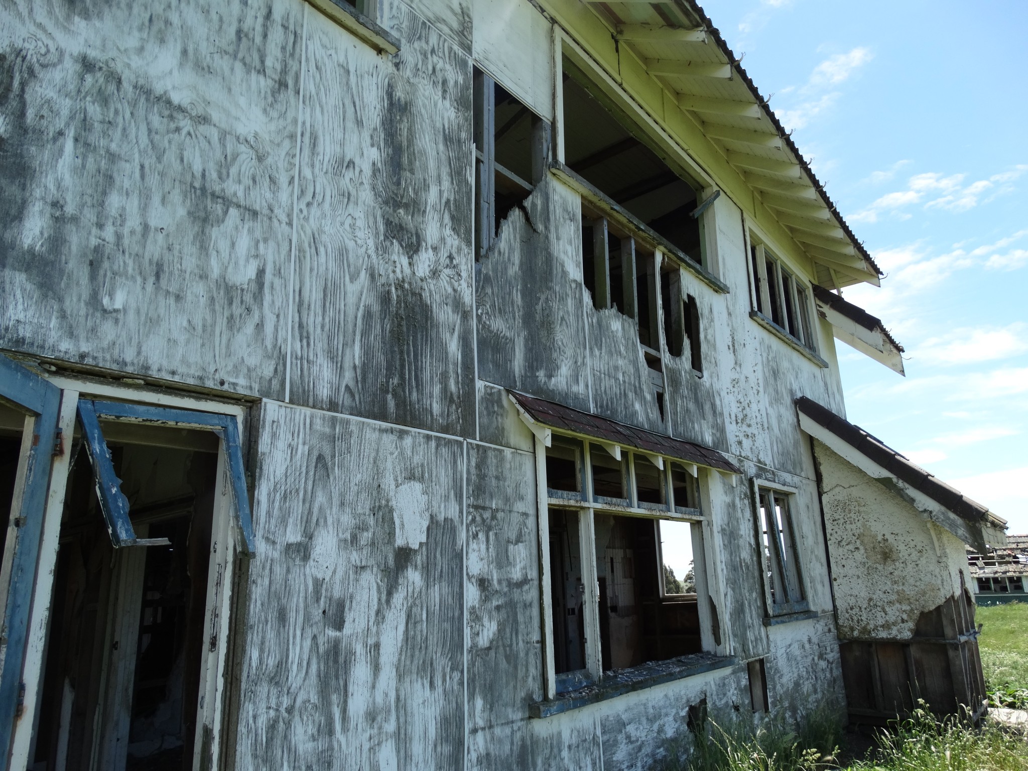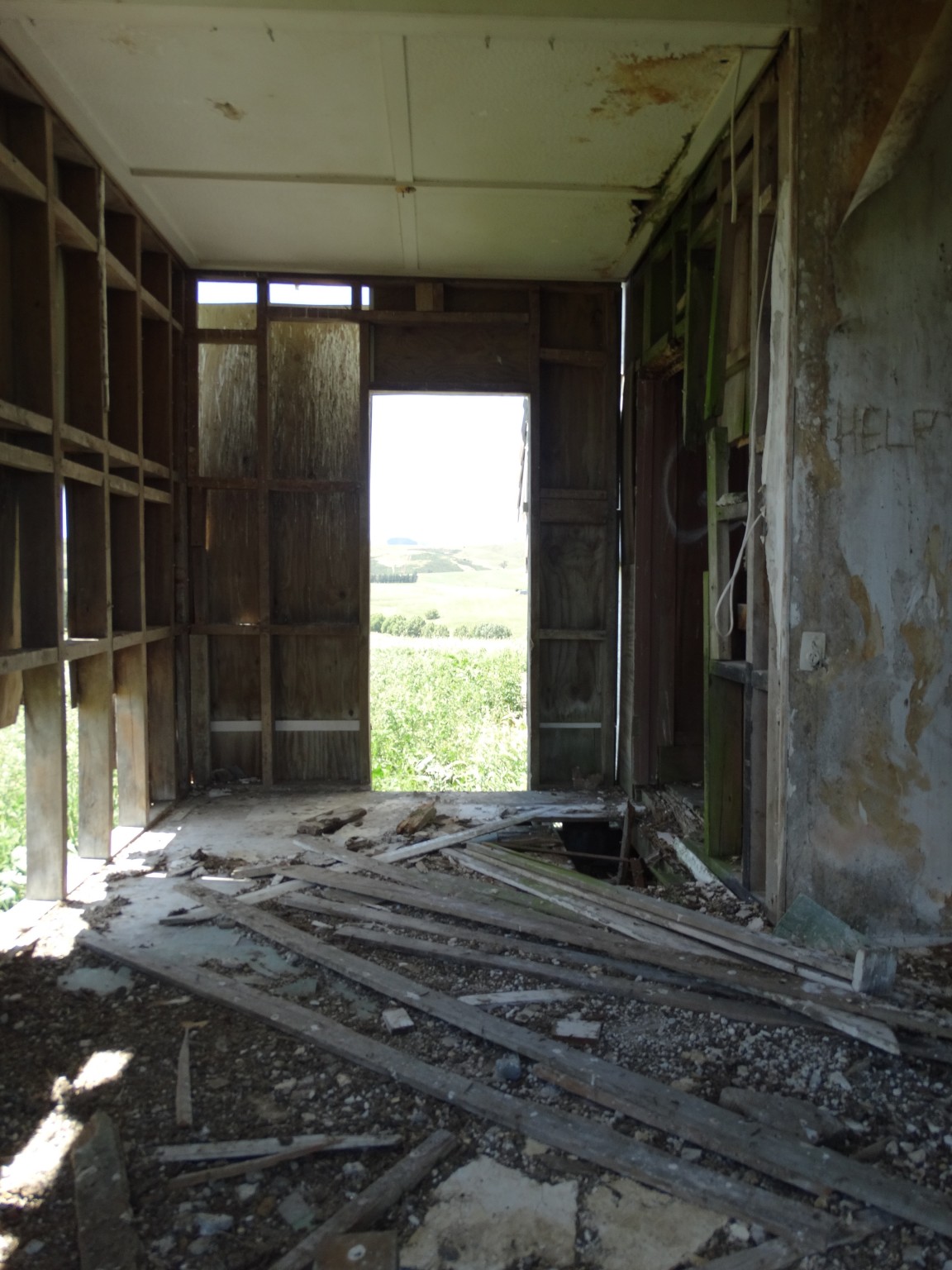 The building was shifted in two pieces, and it took some time before the second storey was added to the ground floor. Before it could be completed, family difficulties led to the project being abandoned, and the house now sits along and forlorn on the top of a ridge, overlooking the Wairarapa plain and the Tararua Range, and open to the weather from all directions.