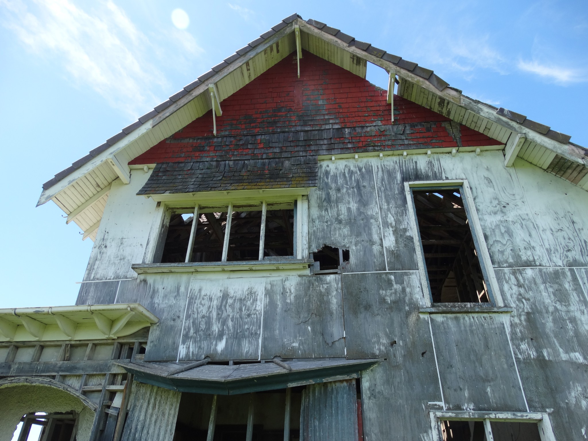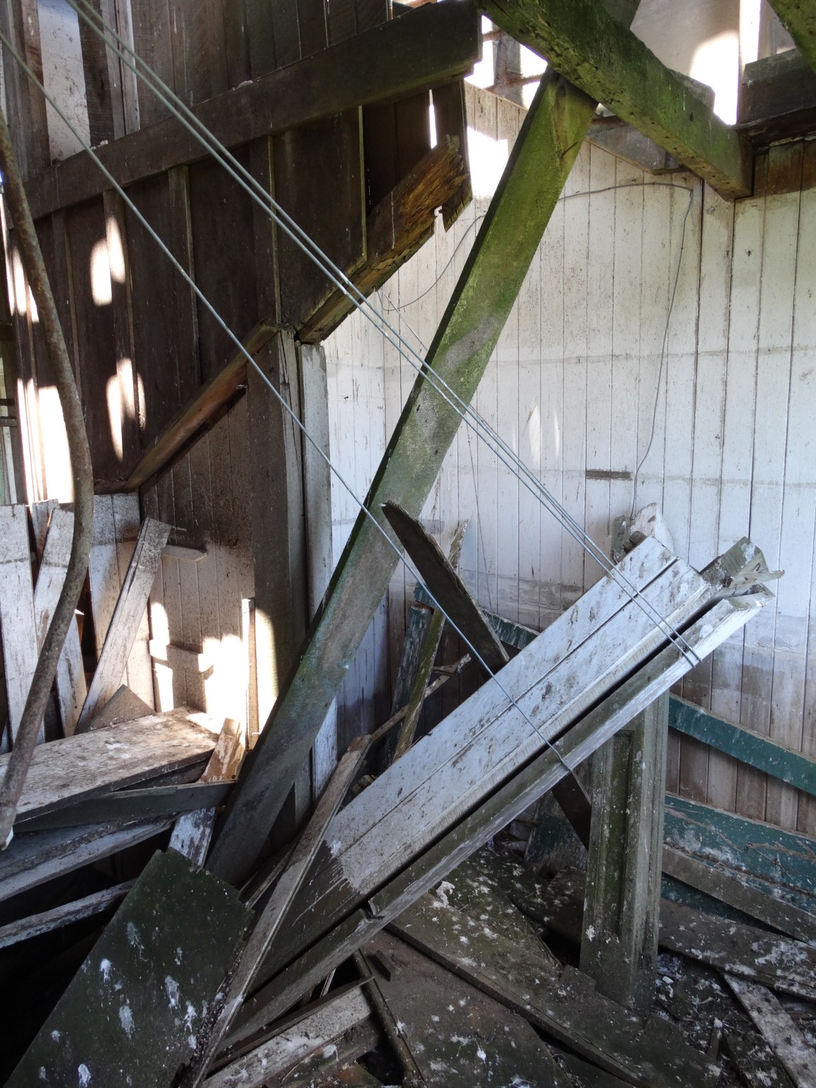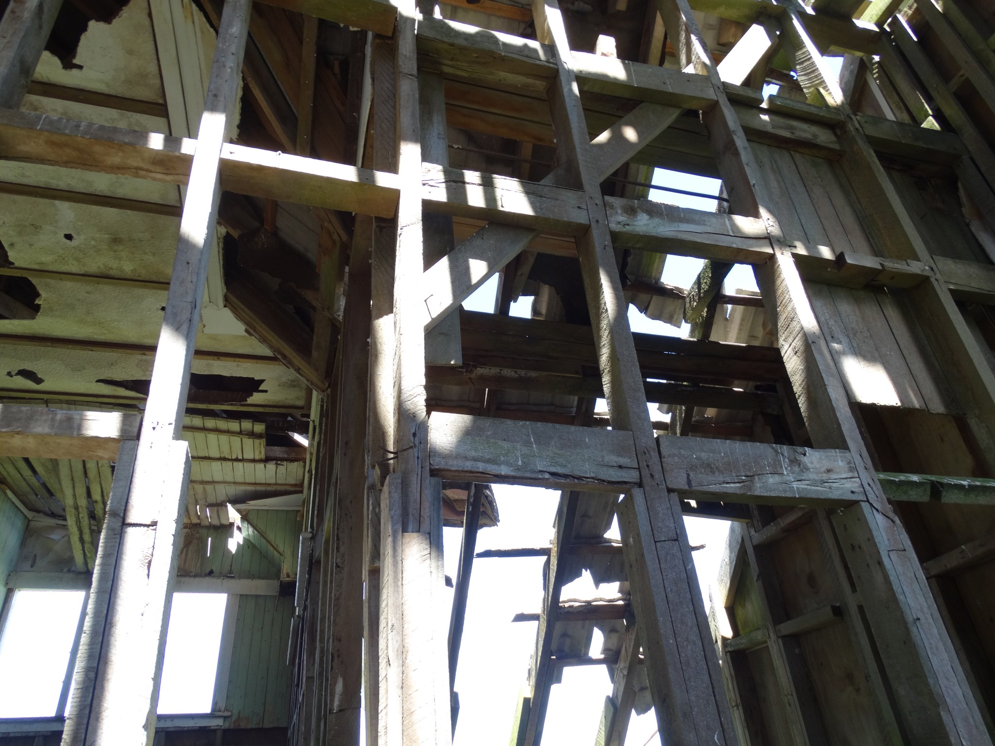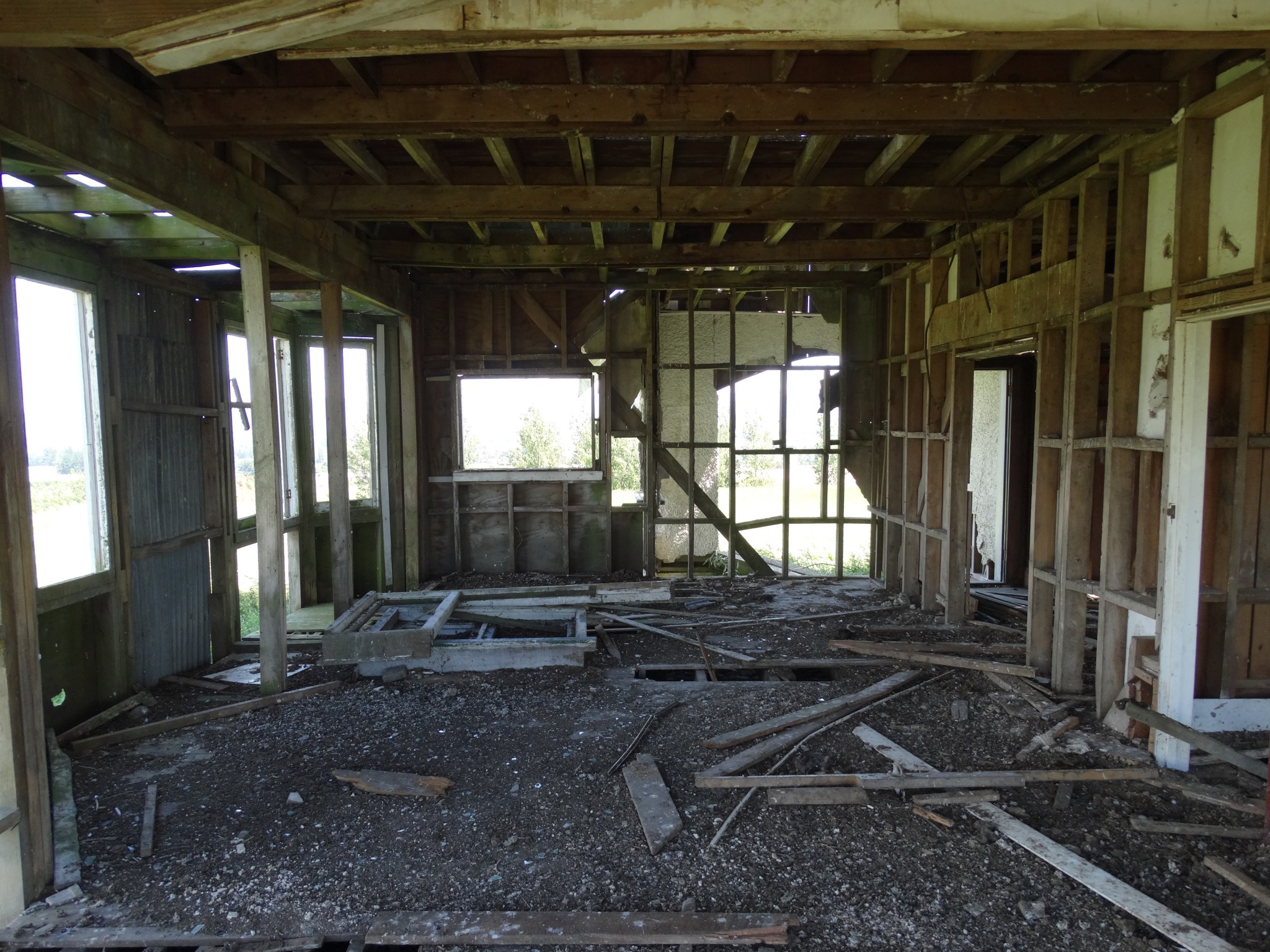 The building was shifted in two pieces, and it took some time before the second storey was added to the ground floor. Before it could be completed, family difficulties led to the project being abandoned, and the house now sits along and forlorn on the top of a ridge, overlooking the Wairarapa plain and the Tararua Range, and open to the weather from all directions.