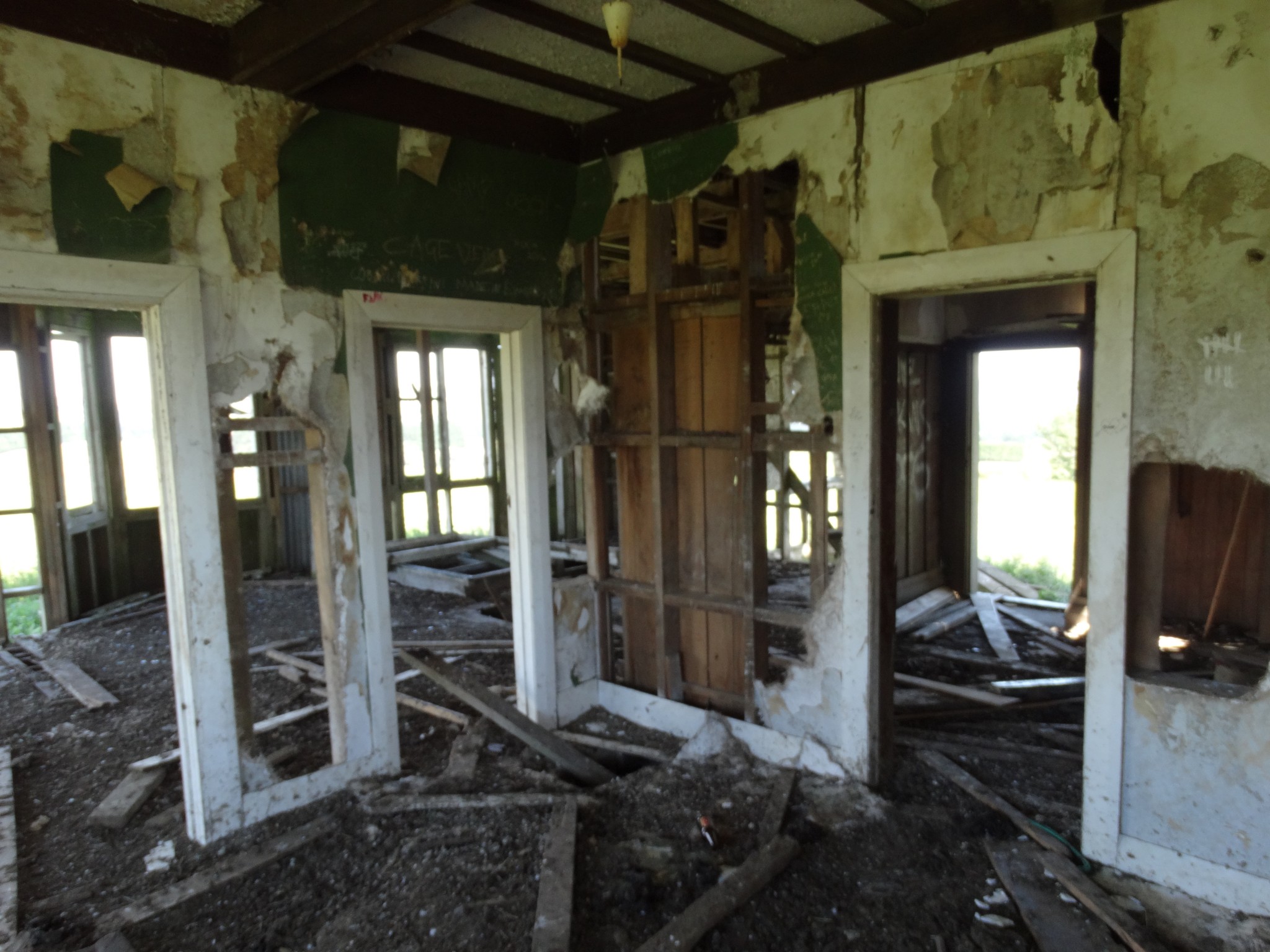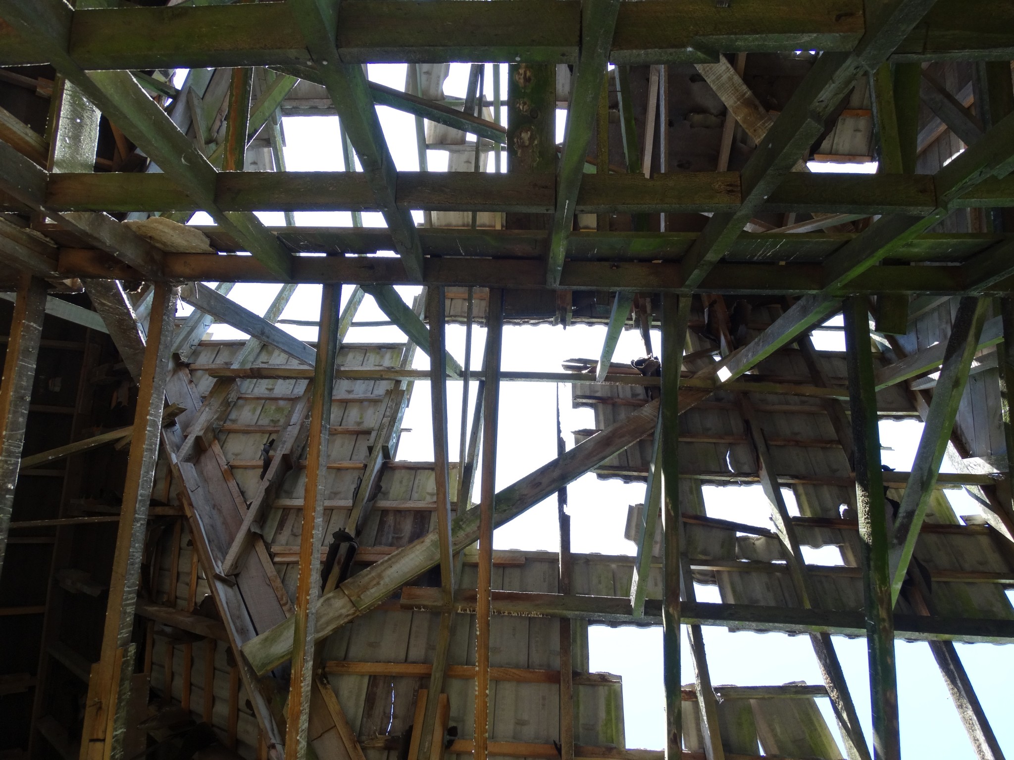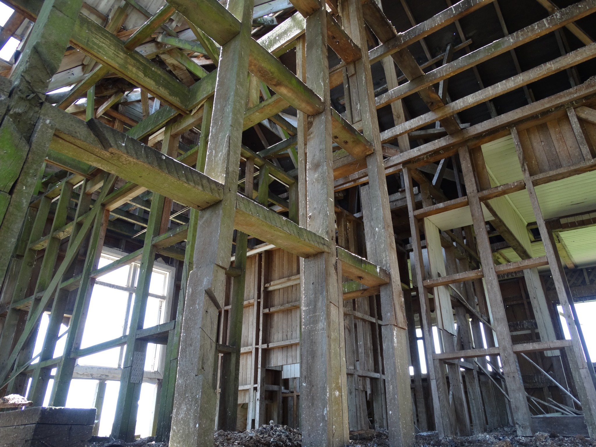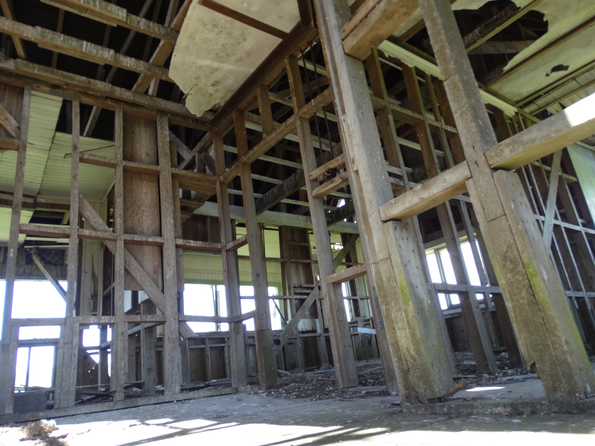 The building was shifted in two pieces, and it took some time before the second storey was added to the ground floor. Before it could be completed, family difficulties led to the project being abandoned, and the house now sits along and forlorn on the top of a ridge, overlooking the Wairarapa plain and the Tararua Range, and open to the weather from all directions.