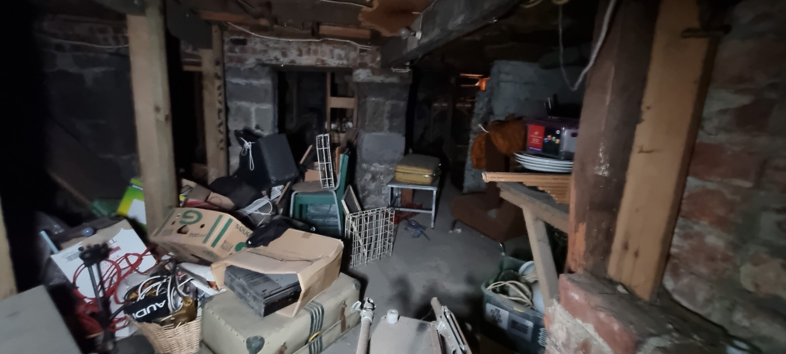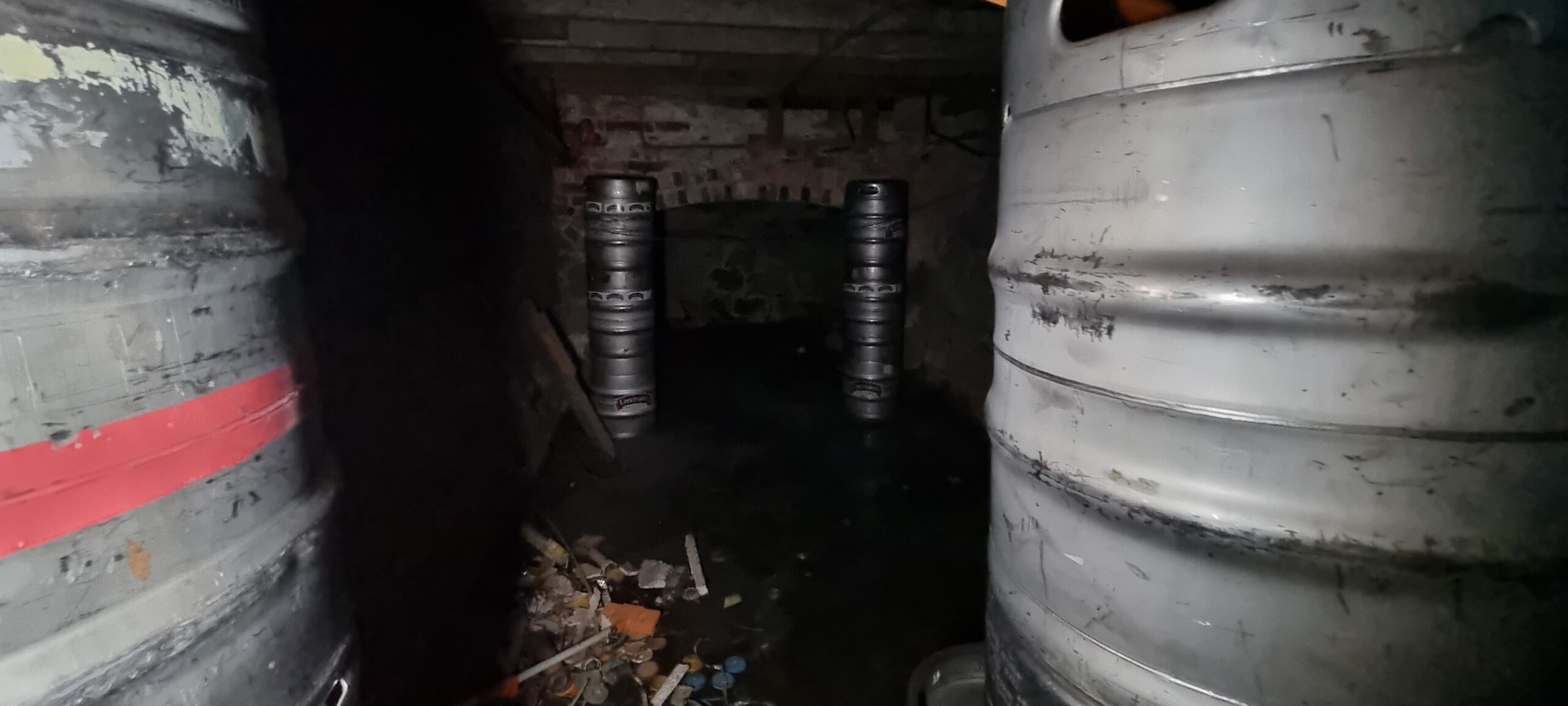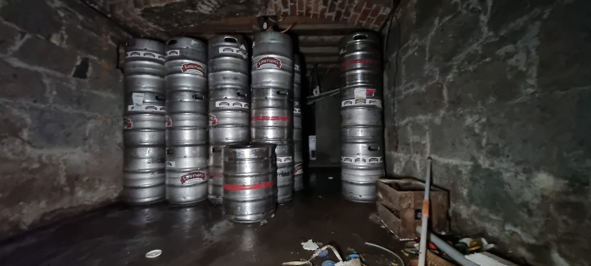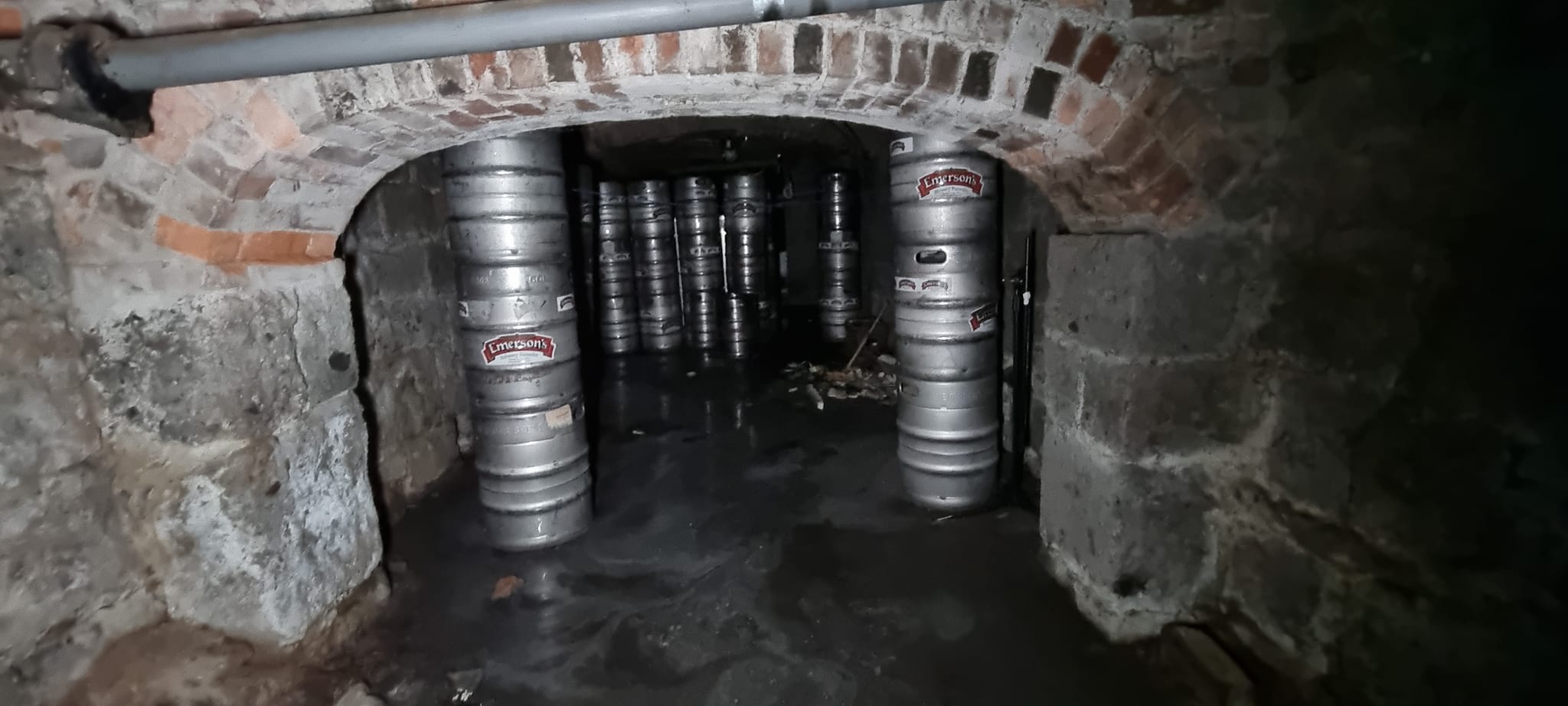 The basement was used as a cellar to store the beer kegs and is accessible via two trapdoors. One is behind the bar for closer access to the keg chiller. The tunnel entrance in the basement is now bricked up and inaccessible.