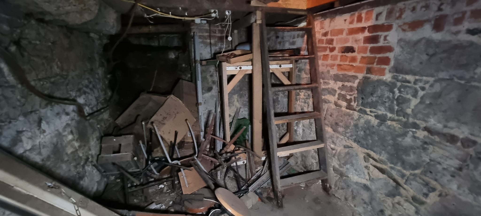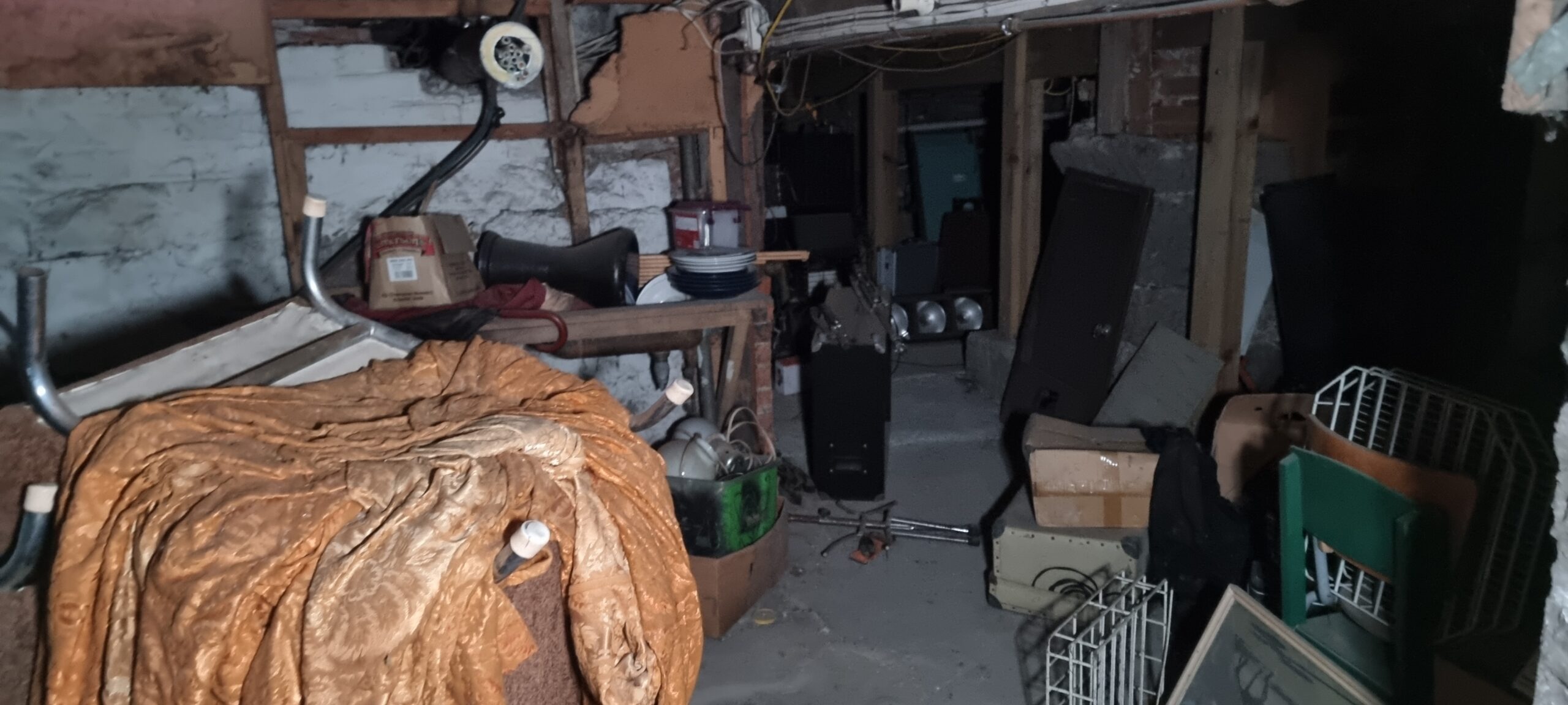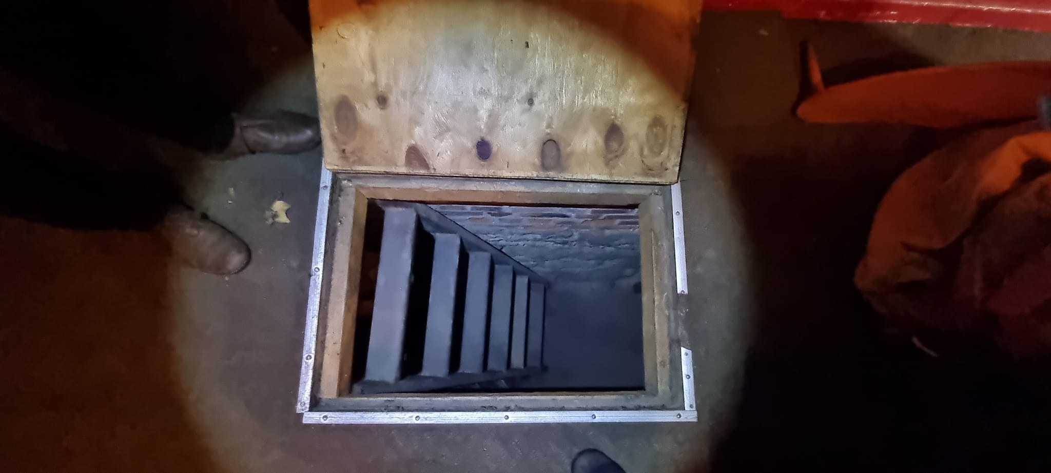 The basement was used as a cellar to store the beer kegs and is accessible via two trapdoors. One is behind the bar for closer access to the keg chiller. The tunnel entrance in the basement is now bricked up and inaccessible.