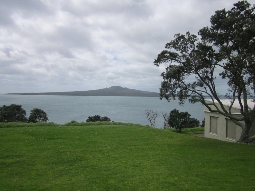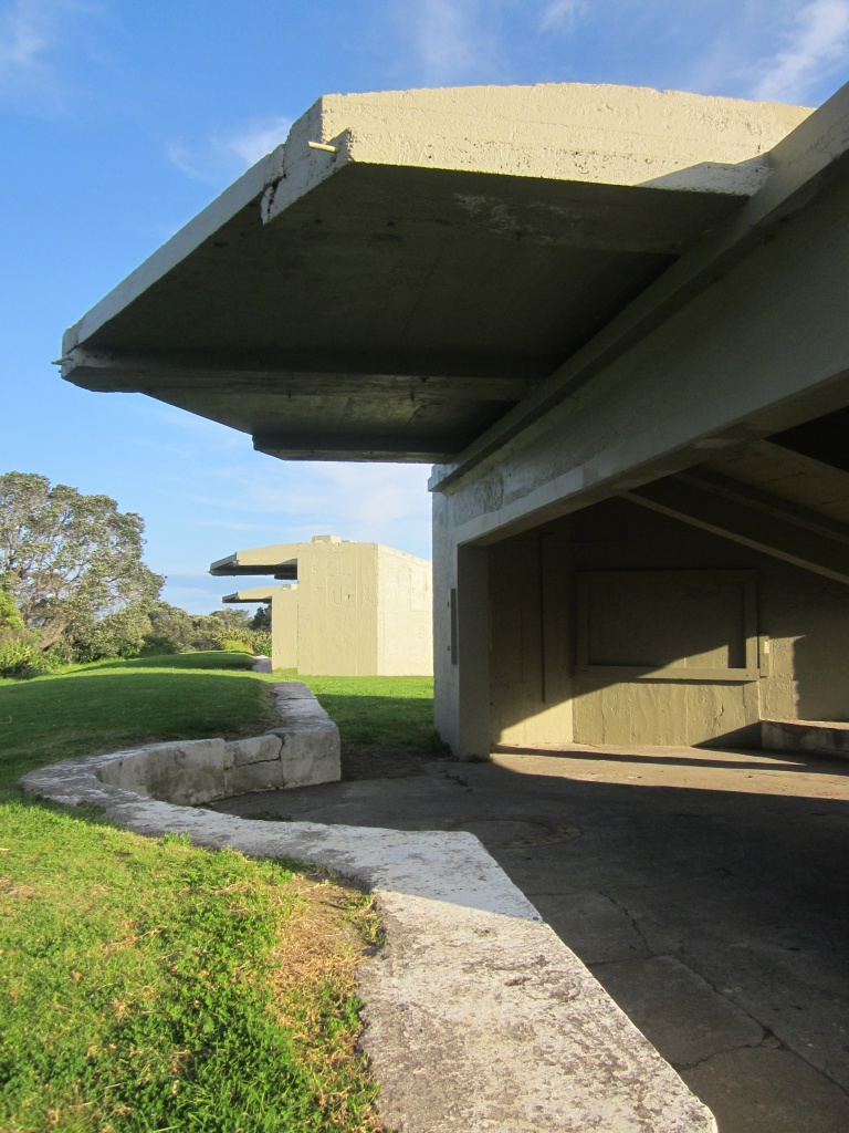 The three white concrete structures on the cliff top were part of the 4 inch ‘Examination Battery’ first established in 1938, which was used to control the anchorage where ships entering the harbour were examined. These guns were originally from the World War I battle cruiser HMS New Zealand. Two can still be seen outside the Auckland Museum.