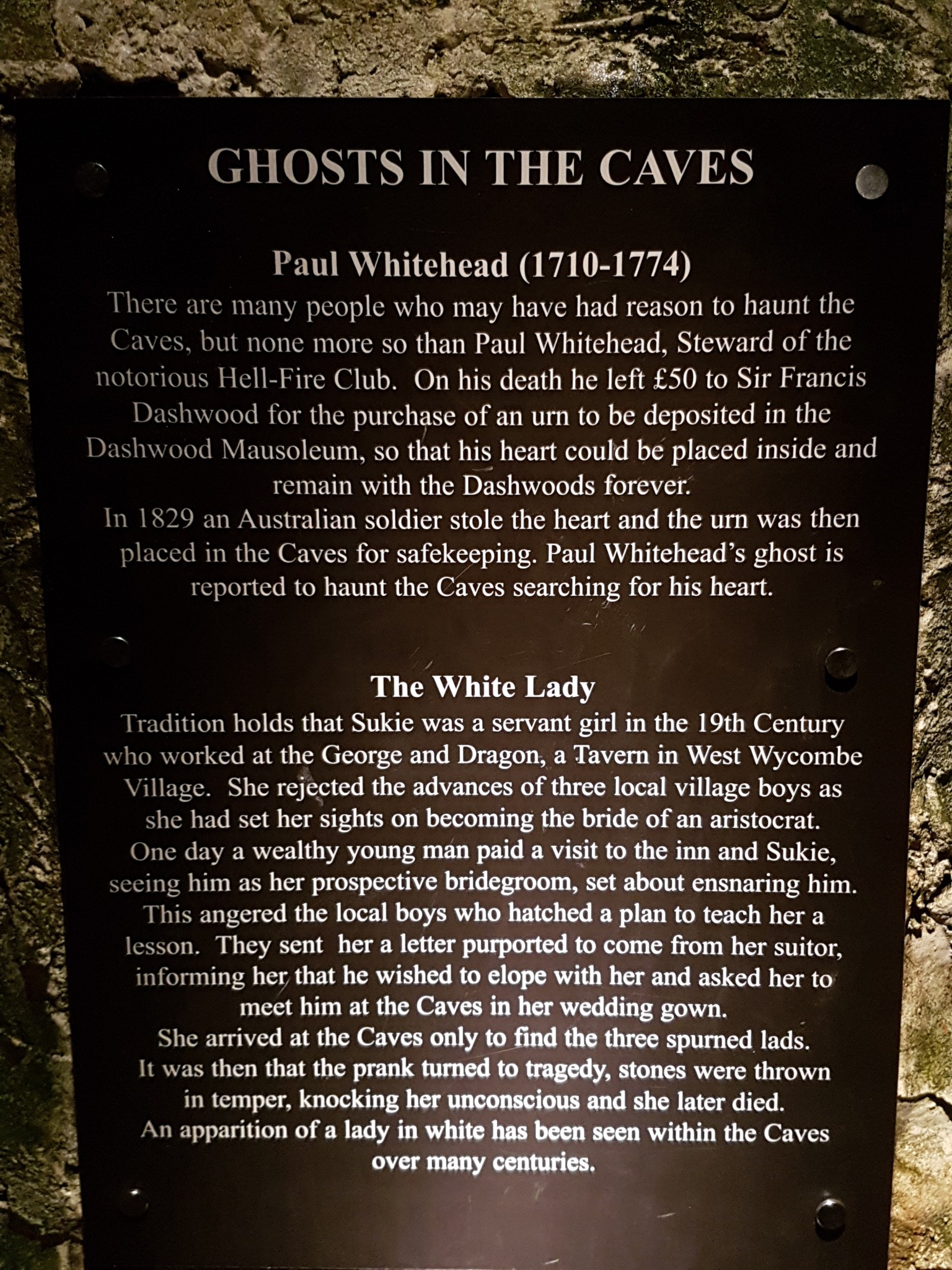 The caves were used as a meeting place for Sir Francis Dashwood’s notorious Hellfire Club, whose members included various politically and socially important 18th-century figures such as William Hogarth, John Wilkes, Thomas Potter and John Montagu, 4th Earl of Sandwich.
