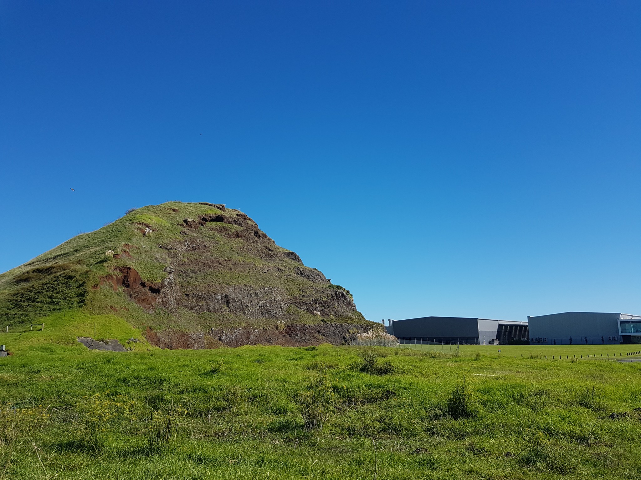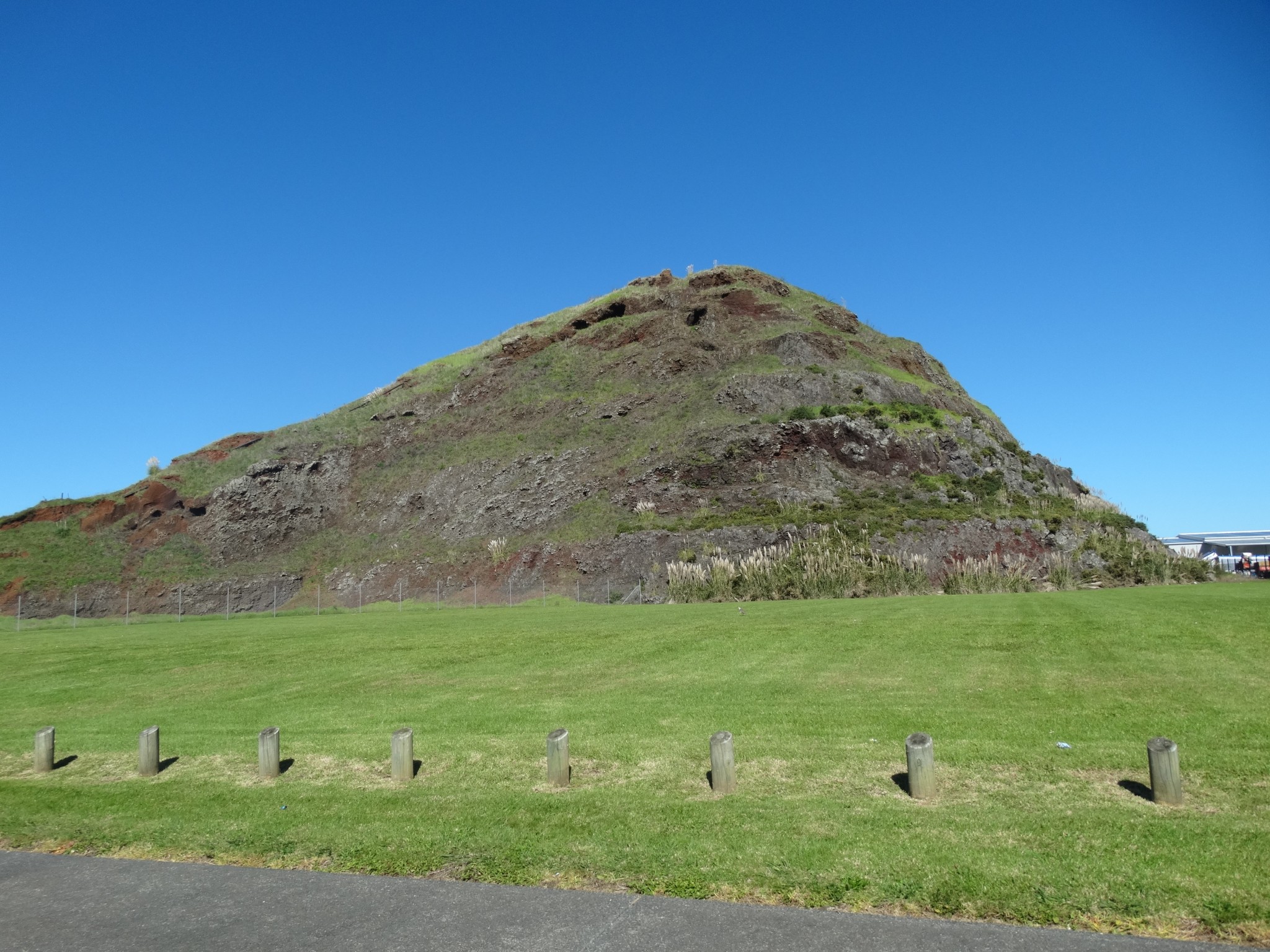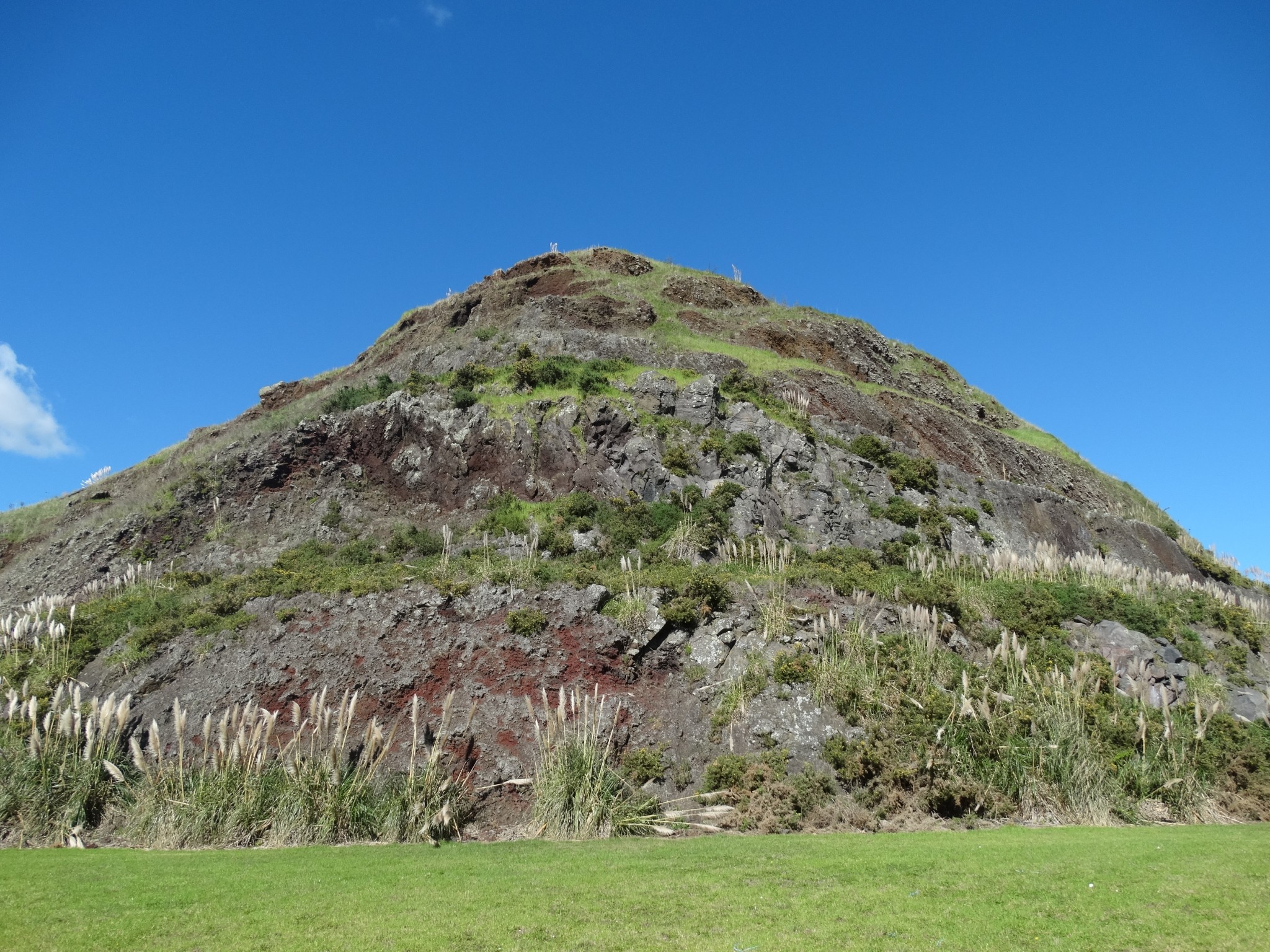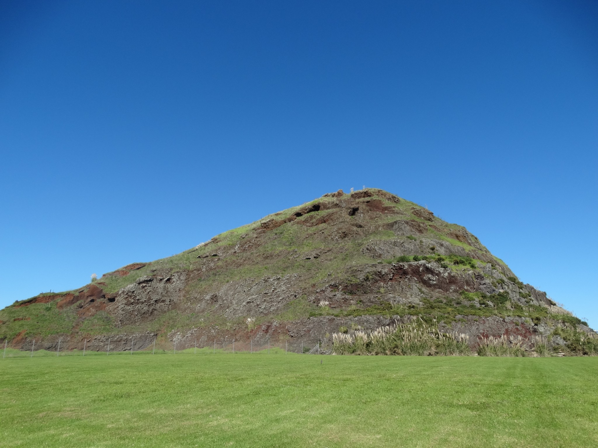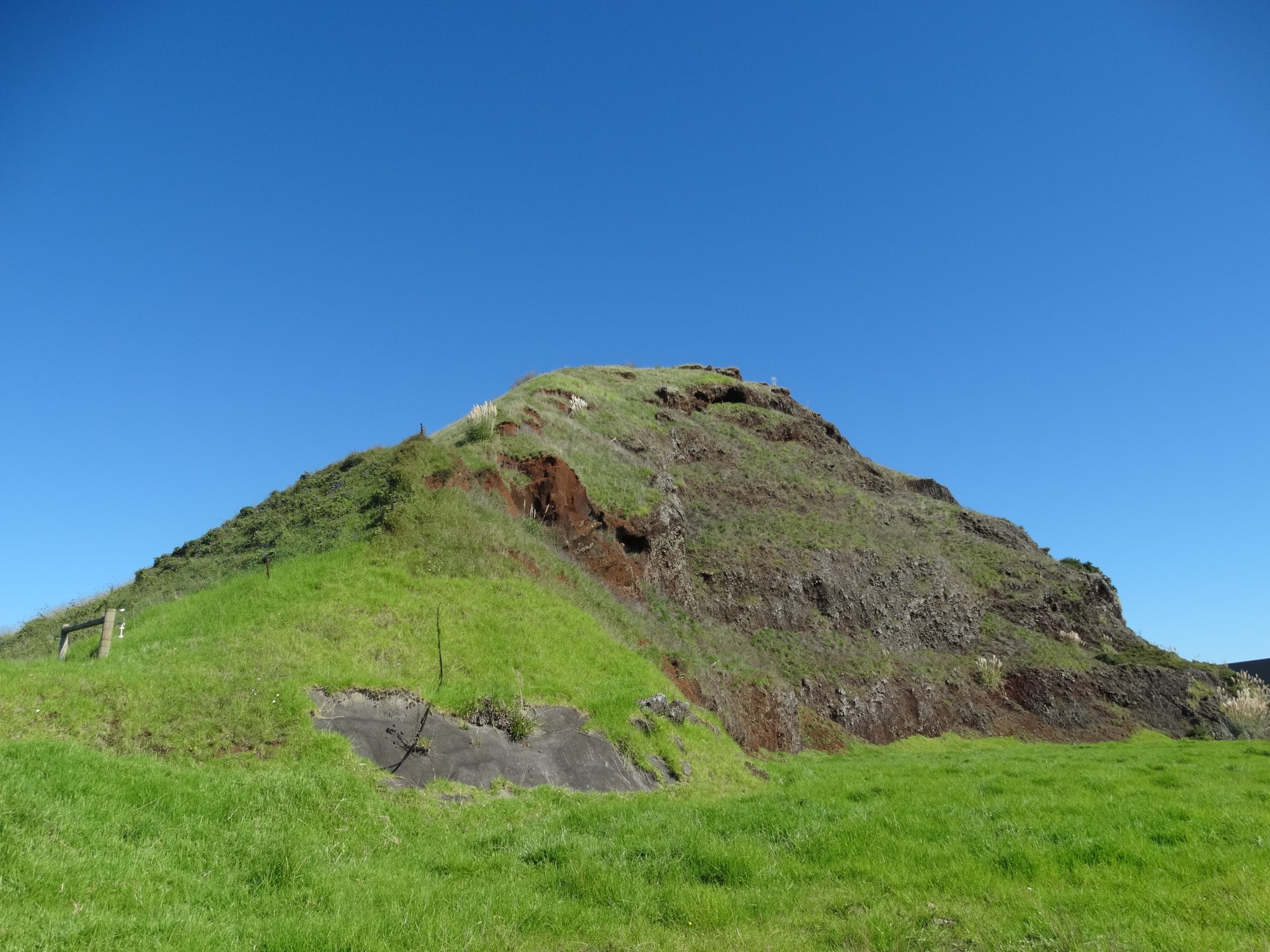 The scoria cone was originally crescent-shaped and featured Māori terraces and kumara pits, before extensive quarrying reduced it to a pyramid-shaped mound big enough to support the summit water tank for Papatoetoe.