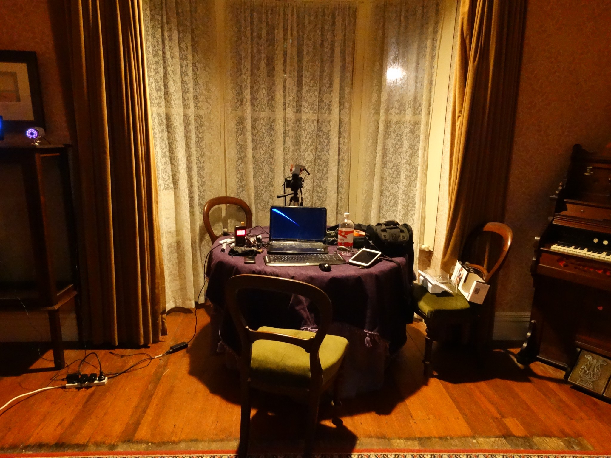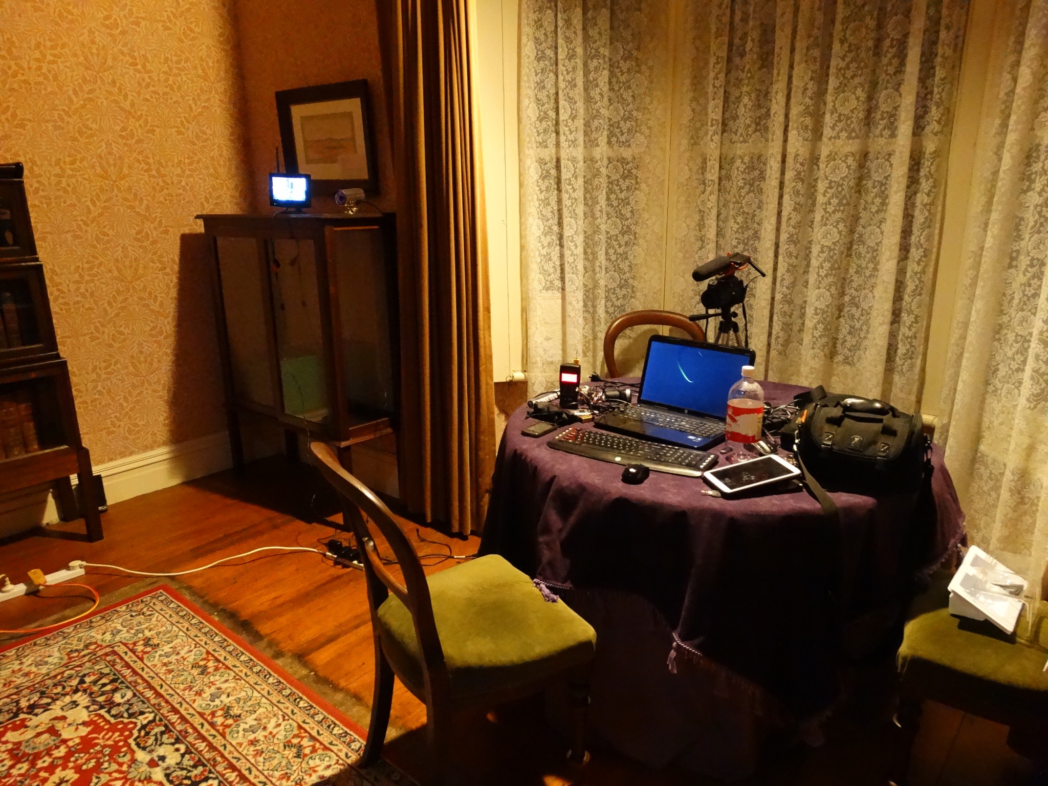 Plus two video cams on tripods. One in lounge aimed down hallway, one in study.