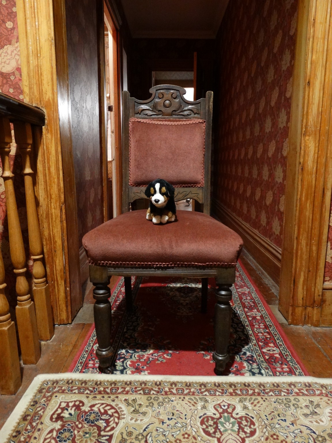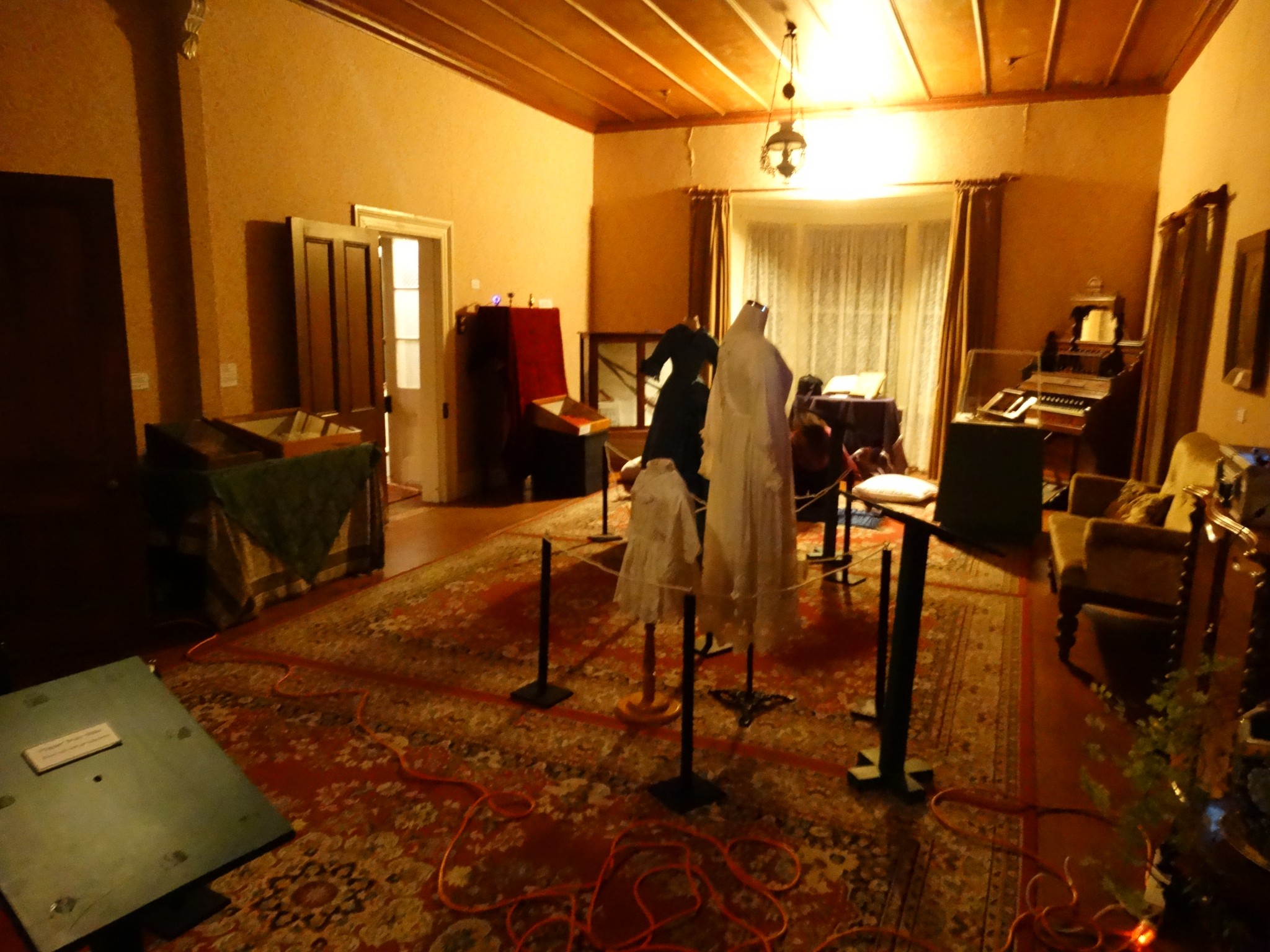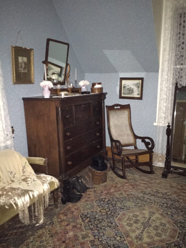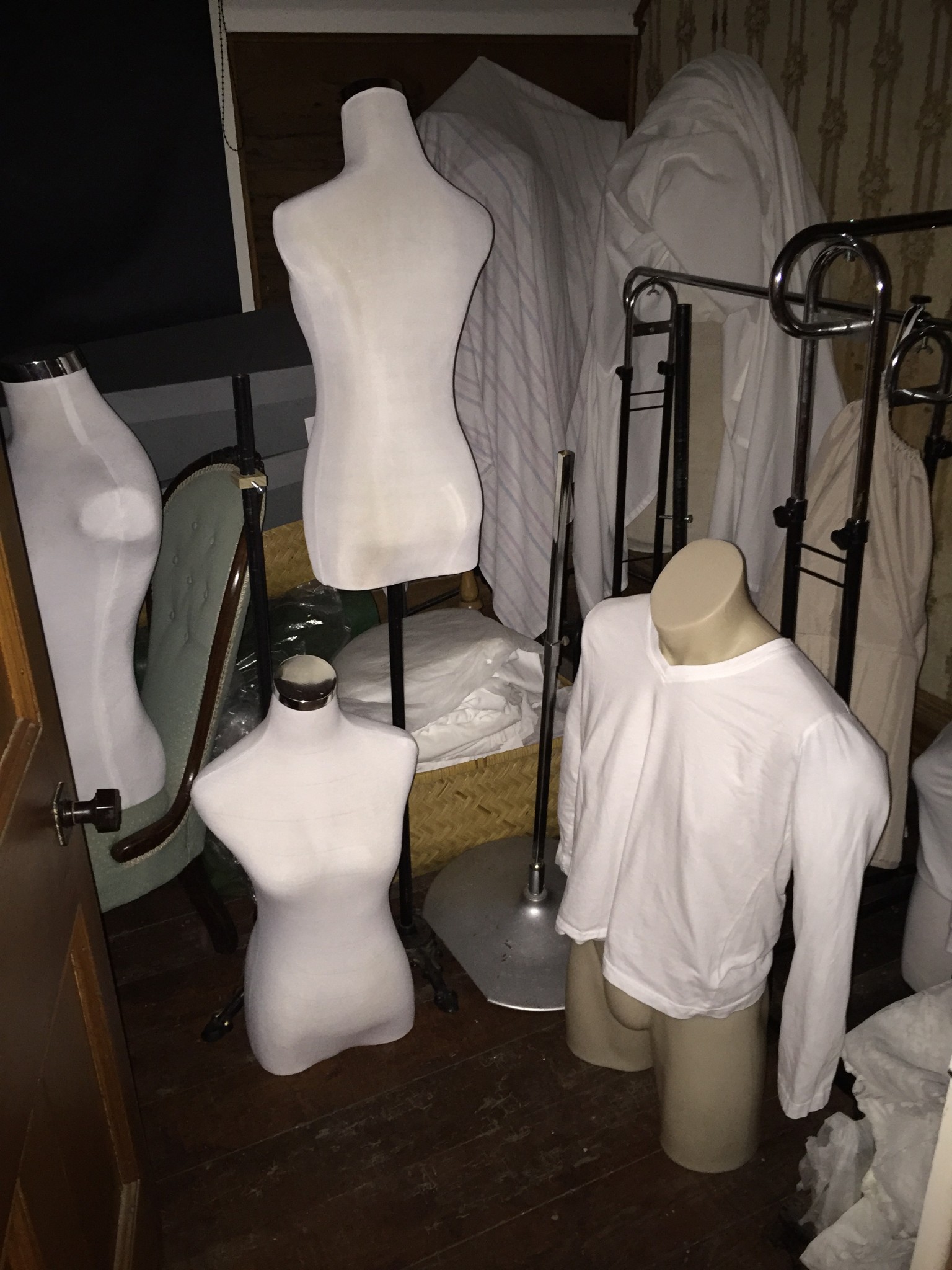A big staircase led to the upstairs hall way. Off the hallway were the main bedroom, a child’s bedroom, a more modern looking sewing room, a room full of pictured and other junk, a small room with mannequins and a room full of filing cabinets.