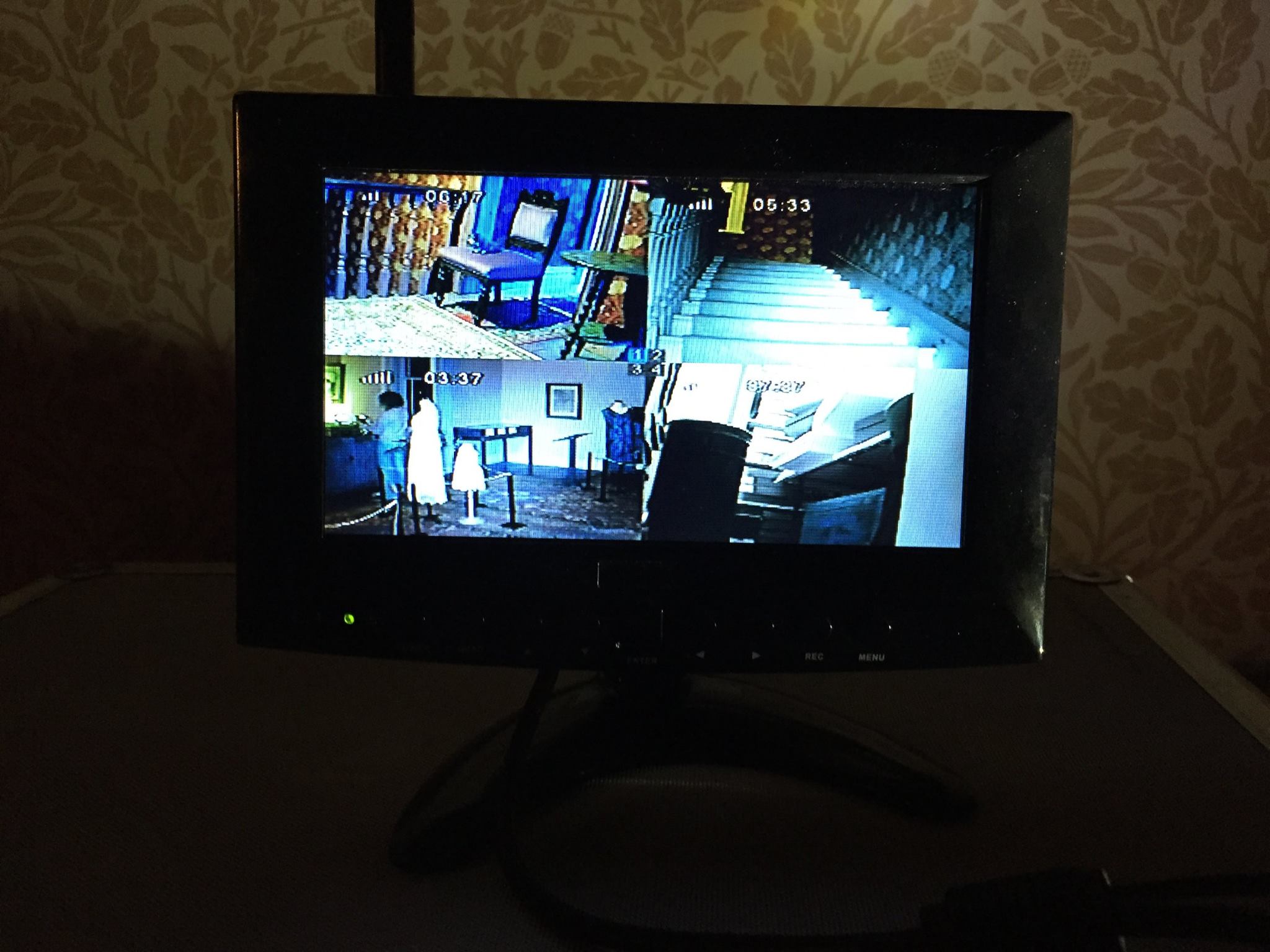 DVR cameras were placed at the bottom of the staircase, looking up the stairwell, in the hallway at the top of the stairs, in the room containing filing cabinets and a metal bin and in the main living room. At the top of the stairs I also placed a toy stuffed dog on a chair as a trigger object but this hadn’t moved by the morning. The living room the video did capture me reacting to the footstep noise, although I’m only just in the shot.
