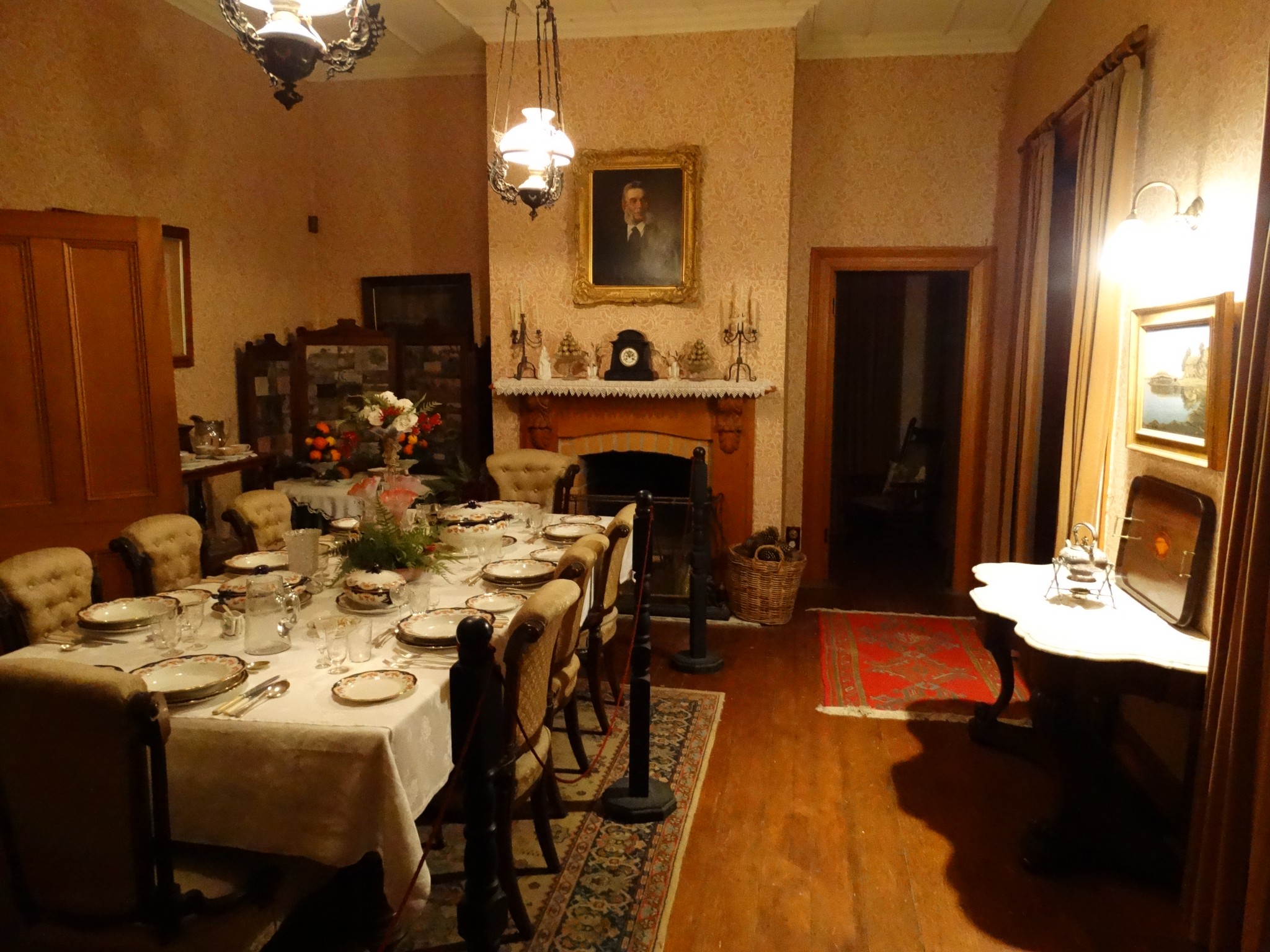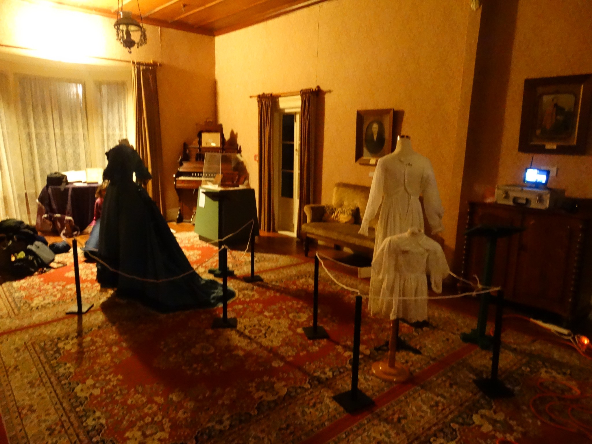 Around 9 pm, I started taking photos around the living room, trying to capture some of the memorabilia. I was busy taking photographs of a badly taxidermied tiger when I suddenly heard loud footsteps walking down the corridor outside of the living room. I would describe them as low heels on a hard or wooden floor, someone walking quite quickly or with a purpose. There were around 6 to 8 footsteps. The footsteps sounded like they were going down the corridor past the toilets and away from the living room.