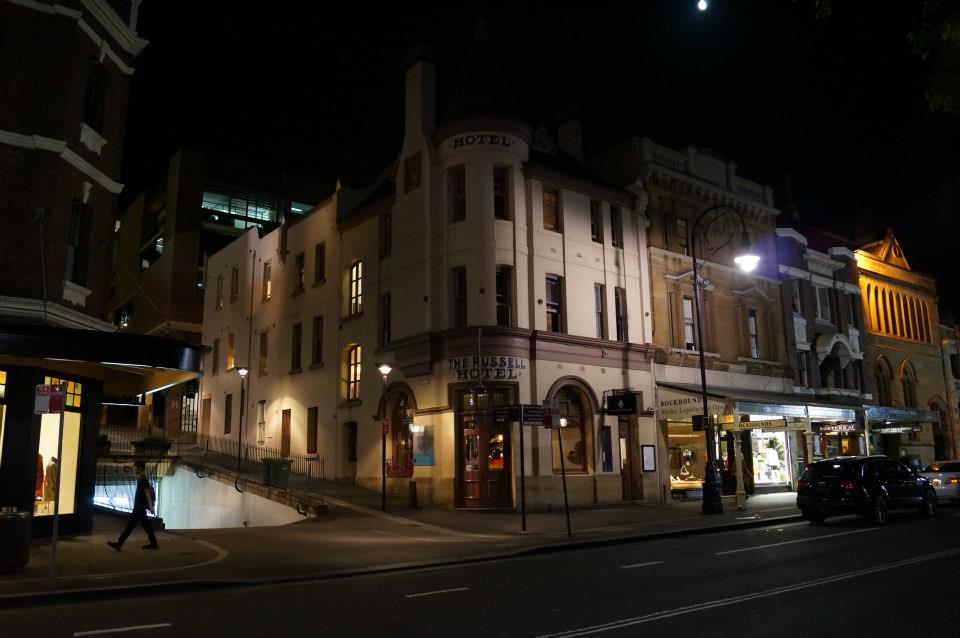 During the following years the Russell Hotel lost some of its charisma when converted to a rooming house. In 1981 restorations work began on the Hotel, which not only covers the corner of George and Globe streets but also includes the 2nd and 3rd stories above ‘Rockhound’ (street number 141), ‘The Sheepskin Shop’ (street number 139) the ‘Fortune of War Hotel’. The Russell Hotel is now a Boutique Hotel offering a range of different priced accommodation with a continental breakfast. It sits on the very popular George Street very close to Circular Quay, The Opera House and Sydney Harbour Bridge. The Russell Hotel also features a wine bar on the first floor.