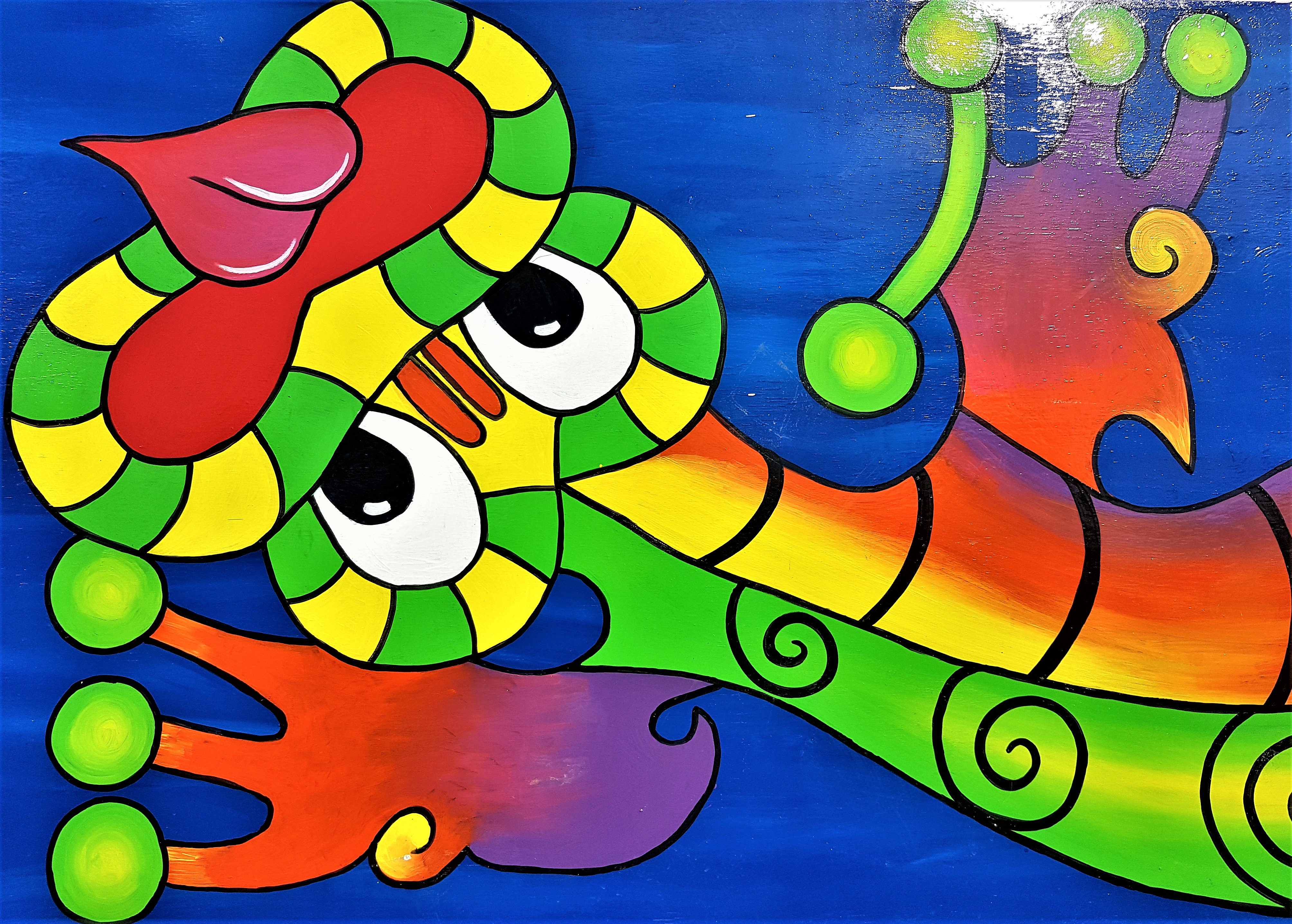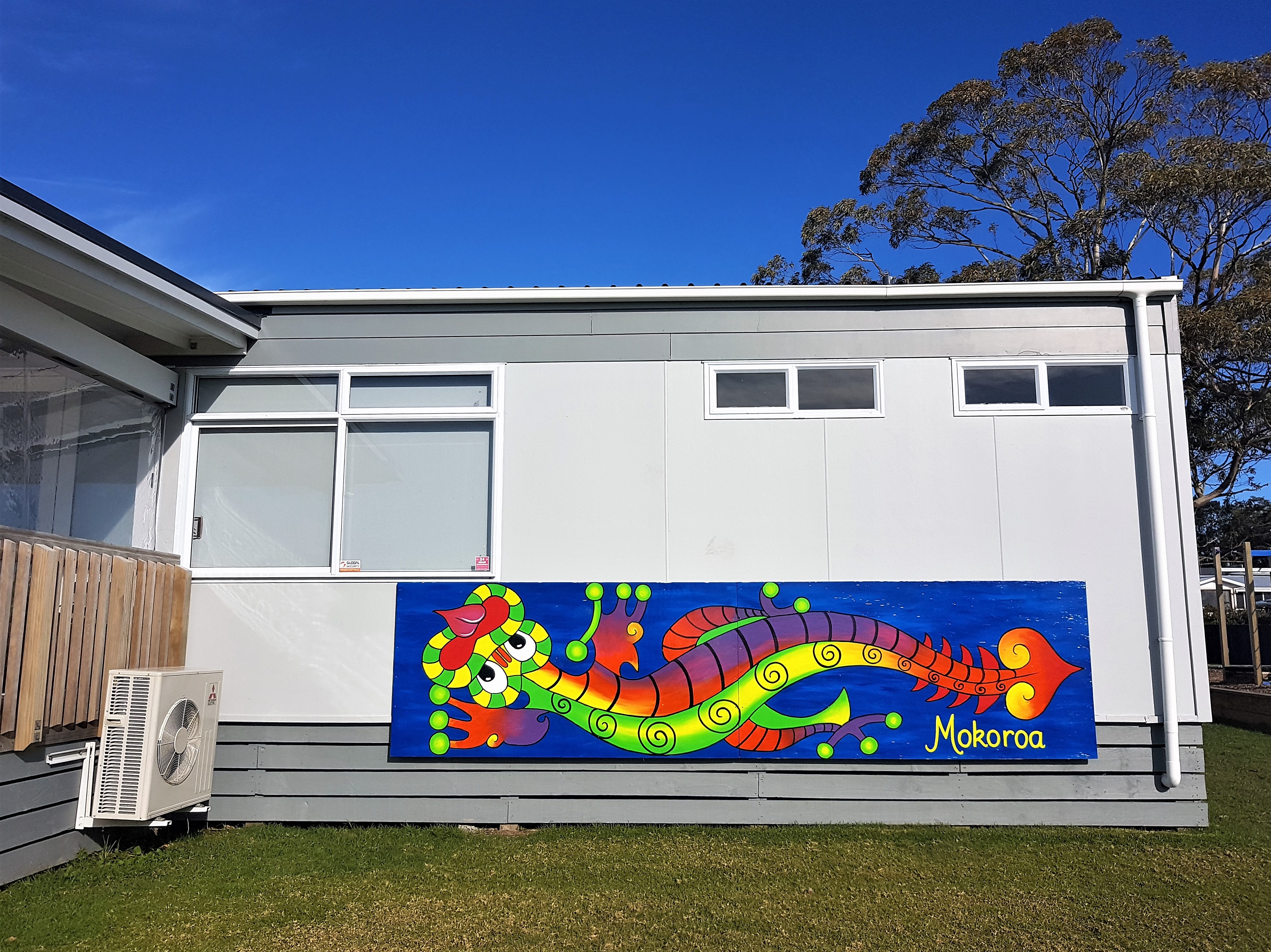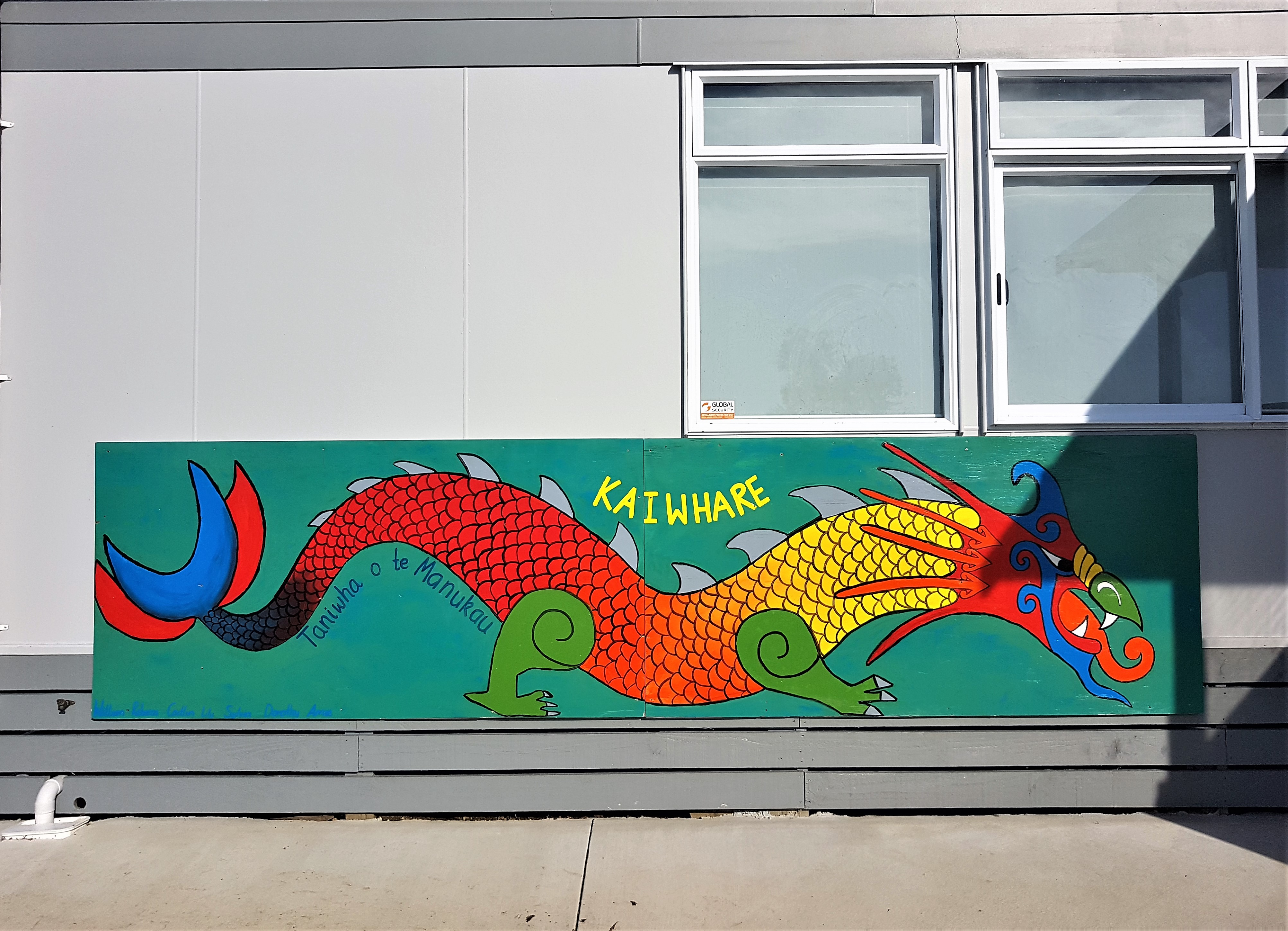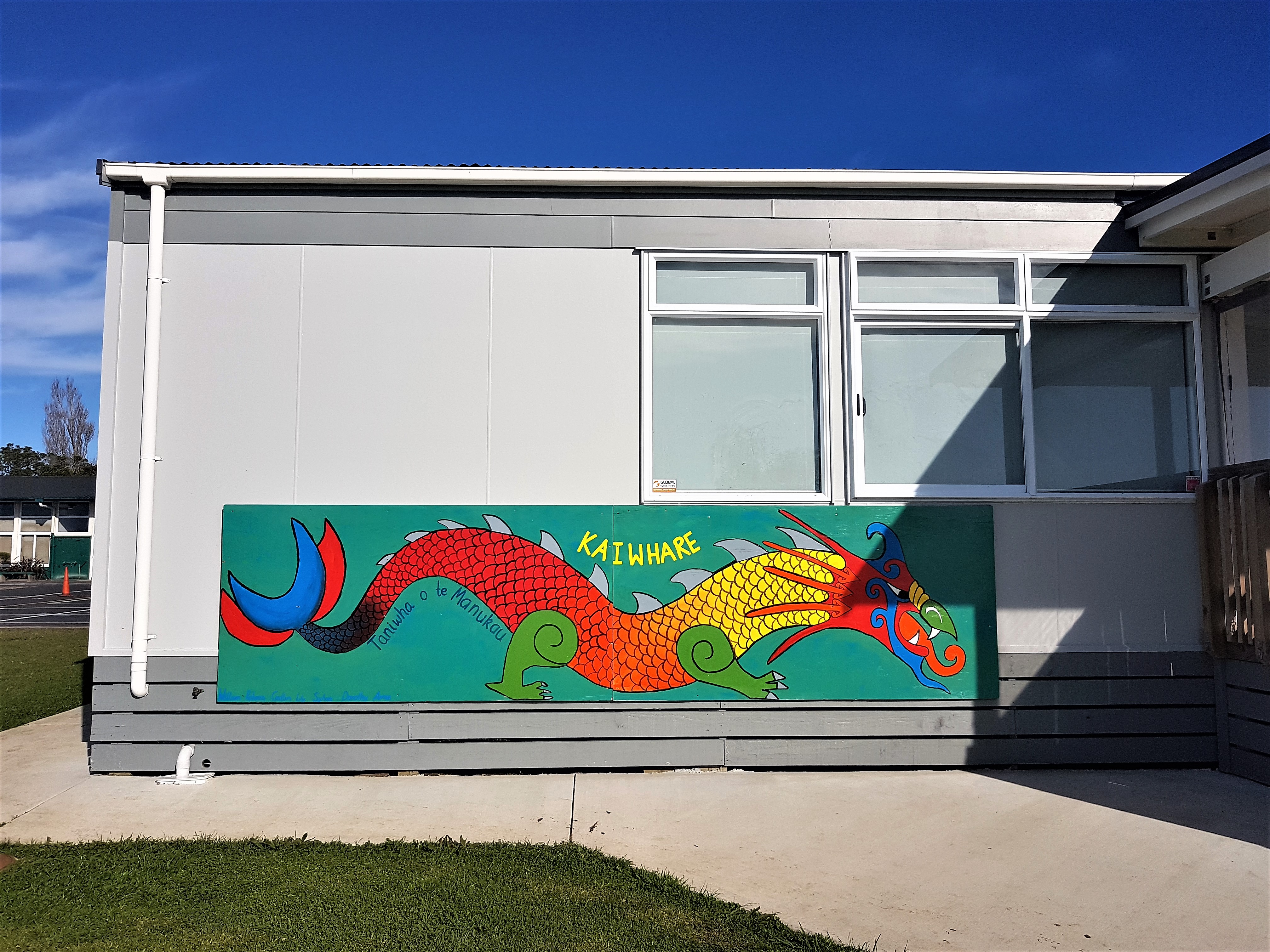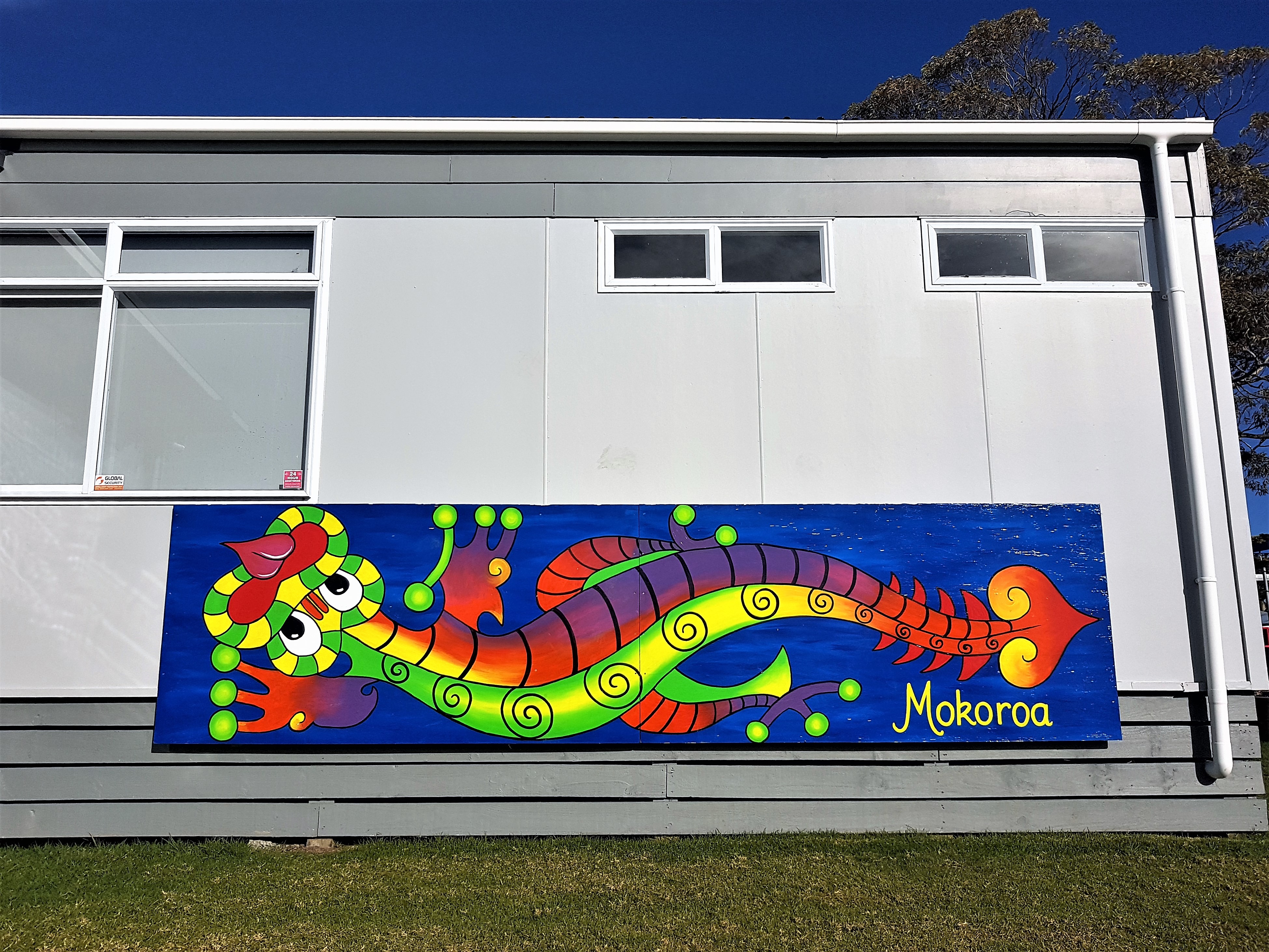 The two brightly coloured Taniwha murals depicting two different water creatures from Maori folklore; Kaiwhare and Mokoroa, are displayed proudly at Waikowhai Primary School in Hillsborough, Auckland and were painted by Miss Daly and some Year 4 students.
