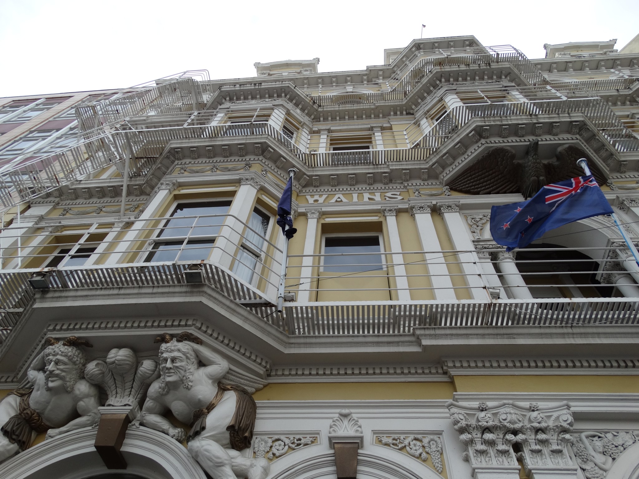 Wains Hotel has an Italianate style, with an elaborate façade noted for its columns, pilasters, and carved figures. At ground level, substantial columns of Port Chalmers basalt breccia rise, topped with capitals of Kakanui limestone. These columns support arches above which sit carved figures of Bacchus, Neptune, and mermaids. The entranceway is topped by a stone balustrade featuring an eagle as its keystone. The upper storeys are equally ornate. Inside, doors and fittings of Tasmanian blackwood complemented the exterior’s grandeur.